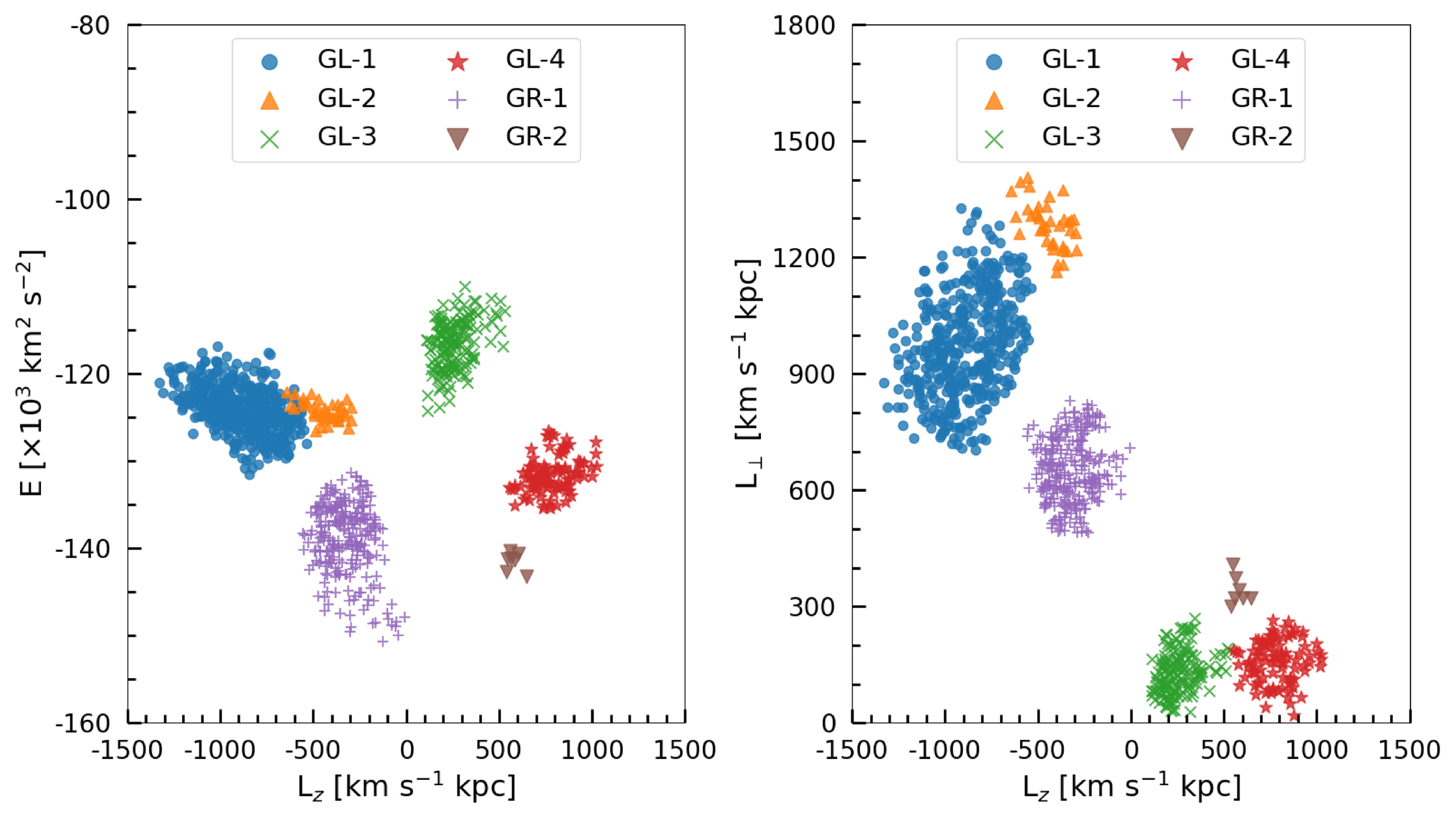 Distribution of member stars of the six substructures in energy E vs. angular momentum Lz space (left panel) and in ﹩{L}_{\perp }=\sqrt{{L}_{x}^{2}+{L}_{y}^{2}}﹩ vs. Lz space (right panel). Different substructures are shown with distinct colors and markers.