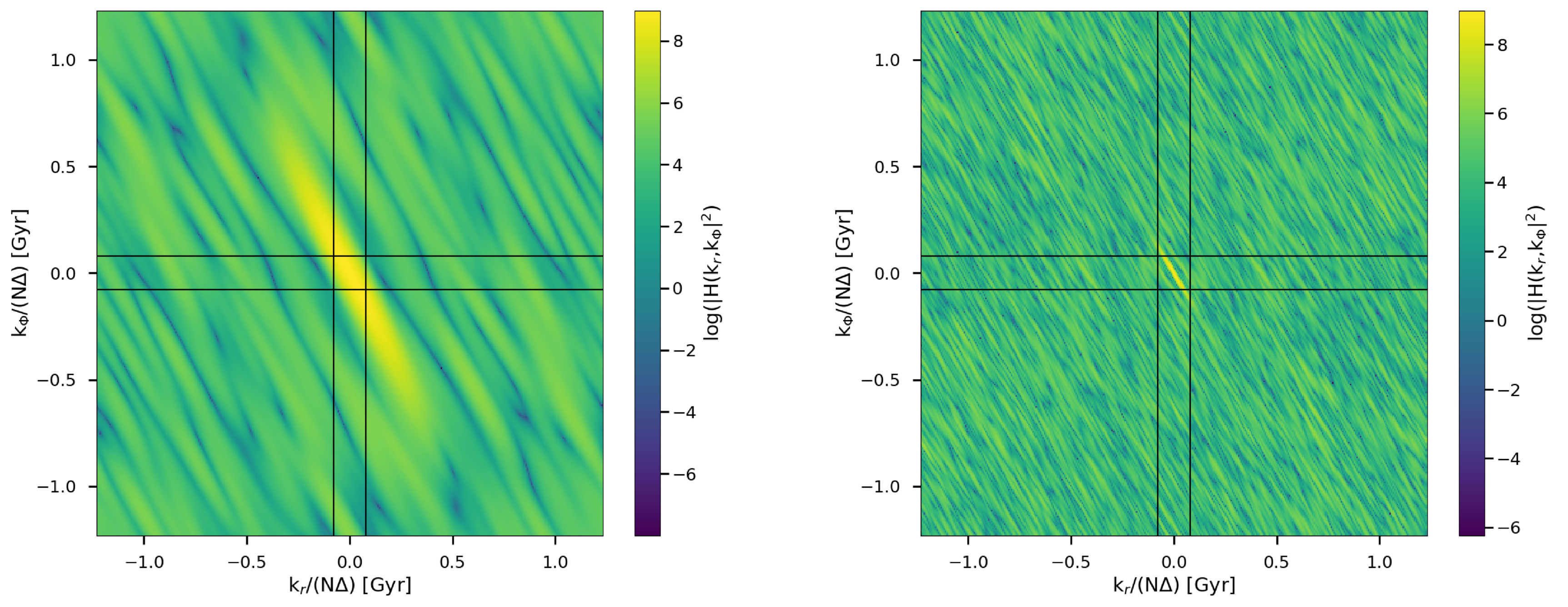 Power spectra of the Fourier transform for substructure GL-1 (left panel) and a random sample (right panel). The axes represent the wavenumbers in the two direction. The black lines mark the regions used to compute the 1D power spectra.