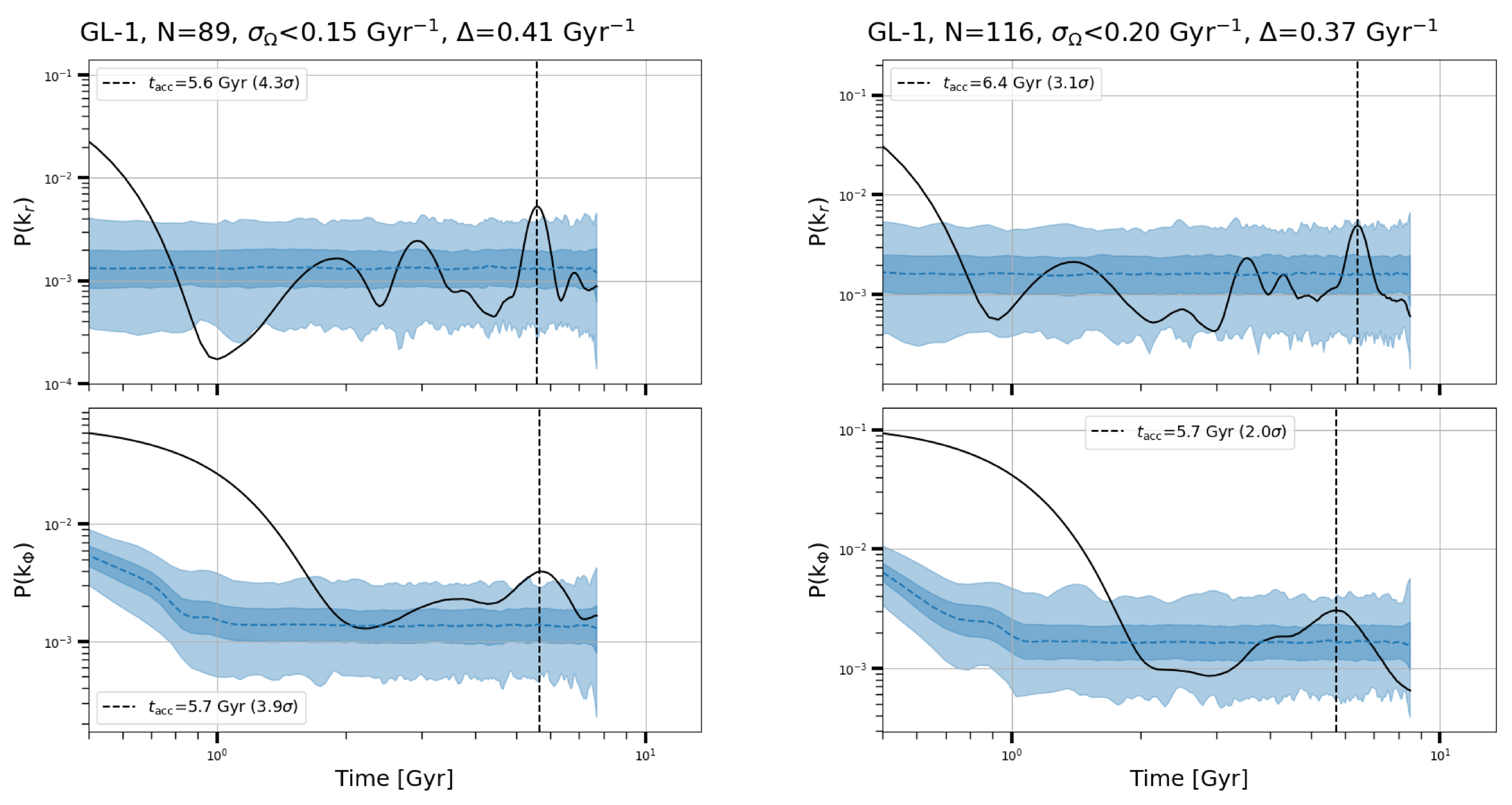 Median 1D power spectra for substructure GL-1 (black solid curves) and random samples (blue dashed curves). The 1σ and 3σ intervals of the random samples are shown as dark blue and light blue shaded regions, respectively. The x-axes represent 2π times the wavenumbers in the r (top panels) and ϕ (bottom panels) directions. The estimated accretion times are marked by black vertical dashed lines, with significances given in the legend. Left and right panels show the results using the A.-C. Eilers et al. (2019) and J. Bovy (2015) potentials, respectively. Subtitles indicate the substructure name, number of stars, bin width Δ, and applied uncertainty selection.