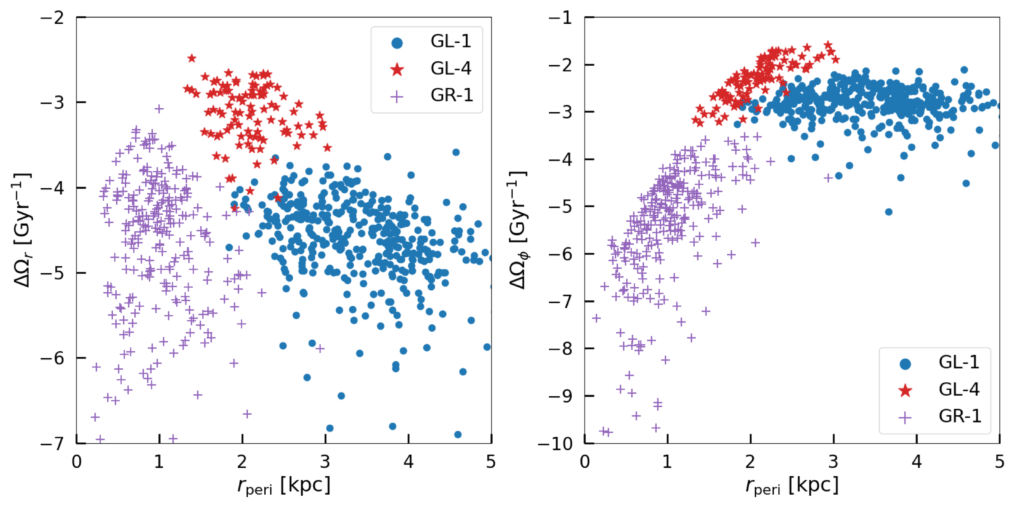 The differences in orbital frequencies between the A.-C. Eilers et al. (2019) and the J. Bovy (2015) potentials (ΩBovy–ΩEilers) for member stars of different substructures vs. orbital pericenters under the A.-C. Eilers et al. (2019) potential. Different substructures are indicated by different colors and markers. Left and right panels show the frequency differences in the r and ϕ directions, respectively.