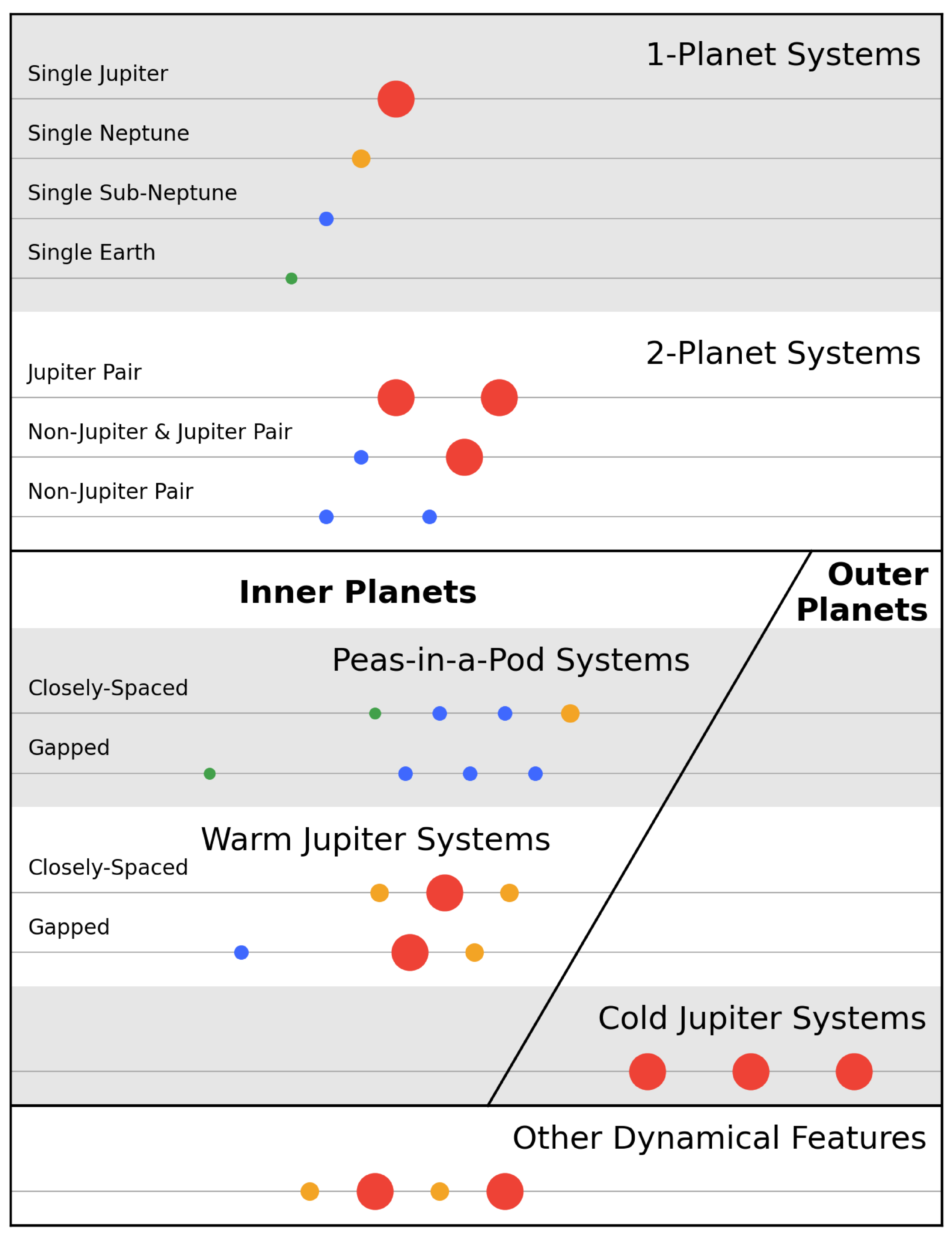 Abridged quick-reference chart for our classification of planetary system architectures presented in Paper I. Each row corresponds to one planetary system, with horizontal spacing corresponding to orbital period on a log scale and point sizes corresponding to planet size. Colors correspond to planet type: Jupiters in red, Neptunes in yellow, sub-Neptunes in blue, and Earths in green.