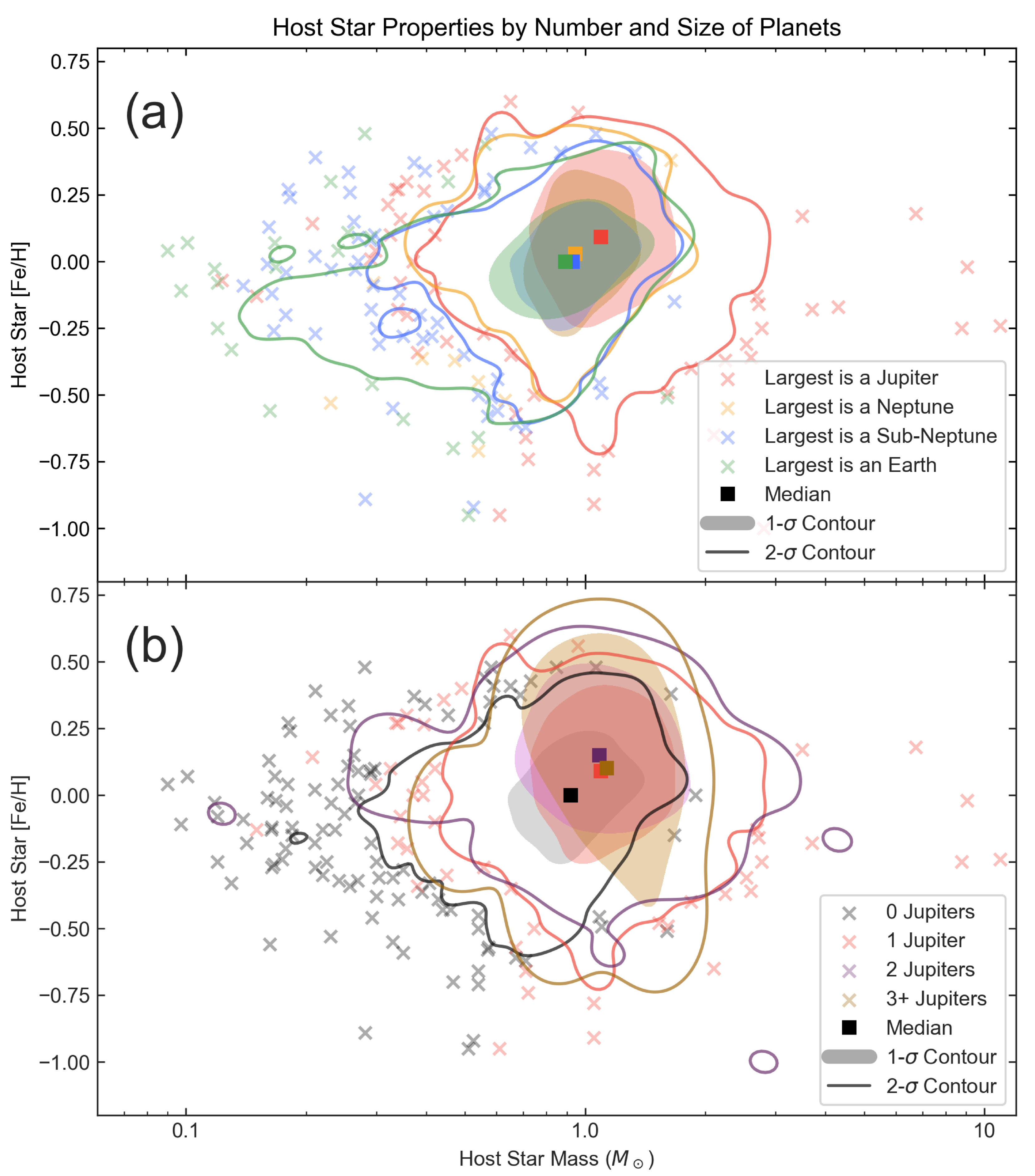 Masses and metallicities of exoplanet host stars divided by planet size and number. Square markers indicate the median points of each distribution. Shaded areas are 1σ density contours; solid lines are 2σ contours, and X’s are >2σ outliers. Panel (a): population divided into subsets based on whether the largest detected planet is a Jupiter (red), a Neptune (gold), a sub-Neptune (blue), or an Earth (green). Panel (b): population divided into subsets with no Jupiters (black), exactly one Jupiter (red), exactly two Jupiters (purple), and three or more Jupiters (dark yellow). (The highest number in our dataset is four.)