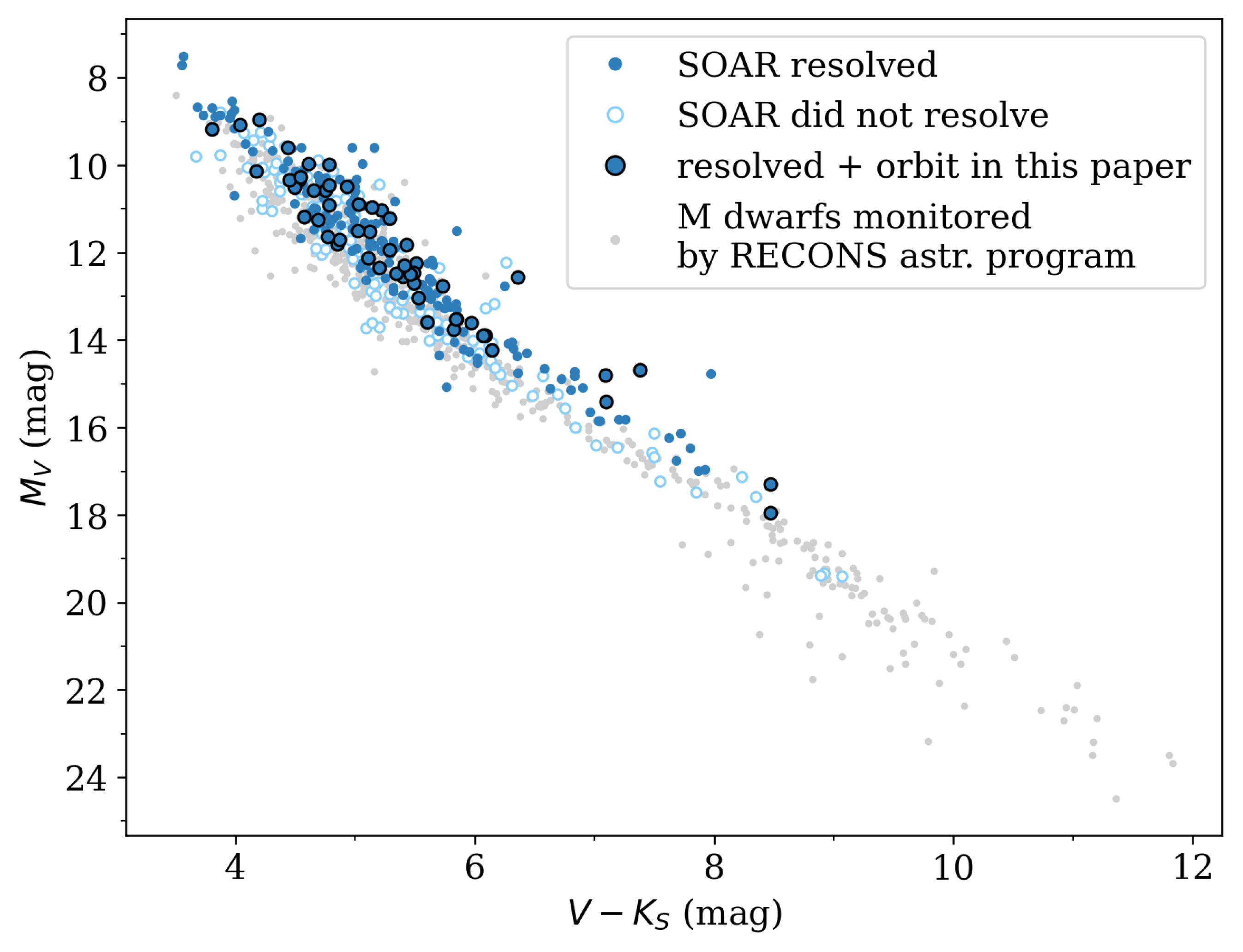 Color–magnitude diagram illustrating the distribution of targets in our sample with respect to the M dwarf main sequence. Each light- or dark-blue point is a pair that has been resolved at SOAR (filled dark-blue circles) or has been observed but not resolved (open light-blue circles); their photometry measurements are listed in E. H. Vrijmoet et al. (2022, Table 1). The 54 points circled in black are pairs for which an orbit is presented in this paper. To illustrate the rest of the low-mass main sequence, these points are overlaid on M and L dwarfs within 25 pc (light-gray points) from the RECONS astrometry program (T. J. Henry et al. 2018).