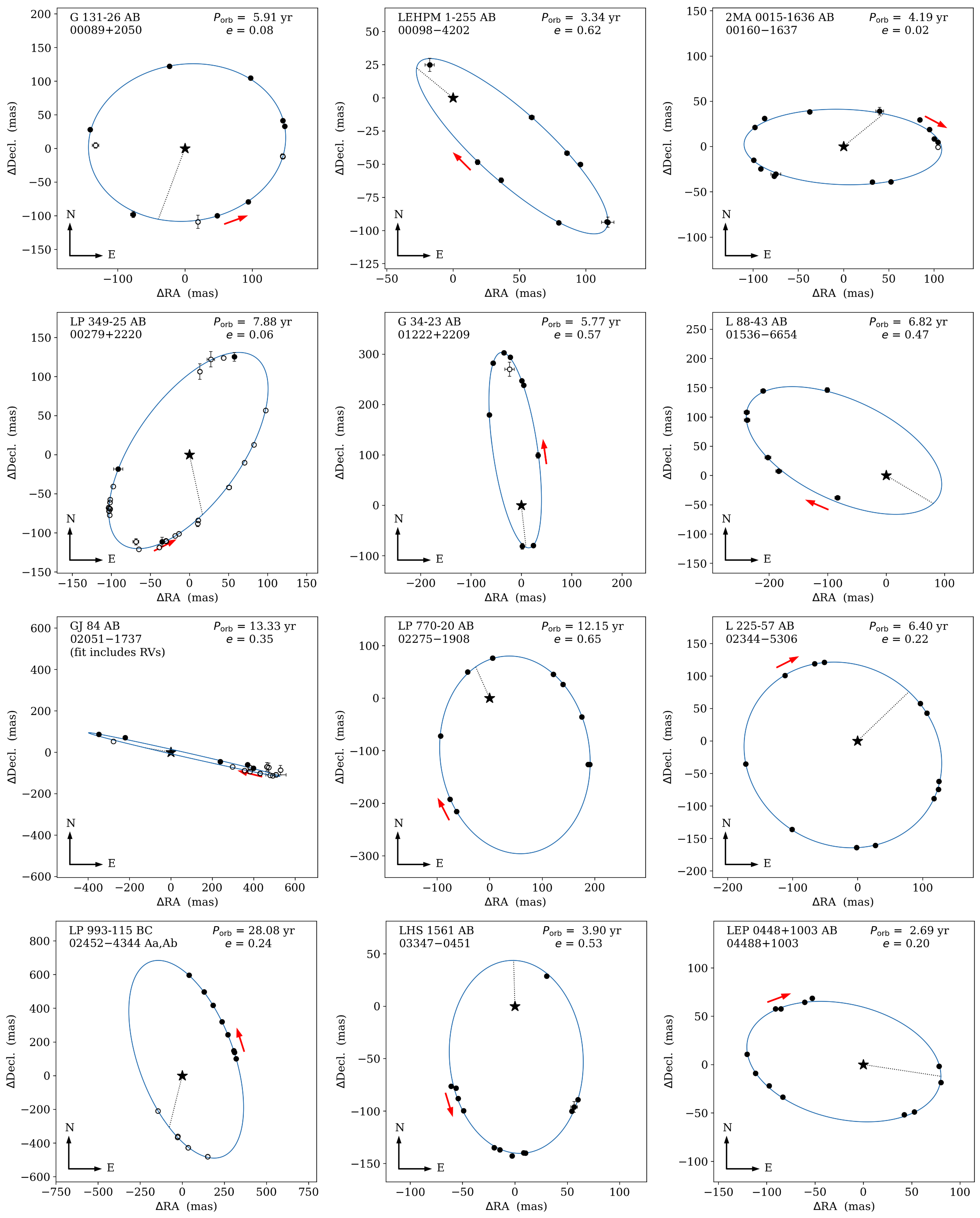 Orbits of M dwarf systems determined from the imaging data in Table 1. One system shown here (GJ 84 AB) also incorporated the RV data in Table 2; its corresponding RV fit is shown in Figure 9. Each orbit’s parameters are given in Table 4 or Table 5, as fit by the code ORBIT (Section 4.4). The points mark observations from SOAR (filled circles) and the literature (open circles), with each indicating the location of the secondary star with respect to the primary (marked by the filled black star). Uncertainties on each observation are plotted here as error bars, but they are often smaller than these point sizes. In each plot, the dotted line shows the location of the periastron, and the red arrow shows the direction of motion.