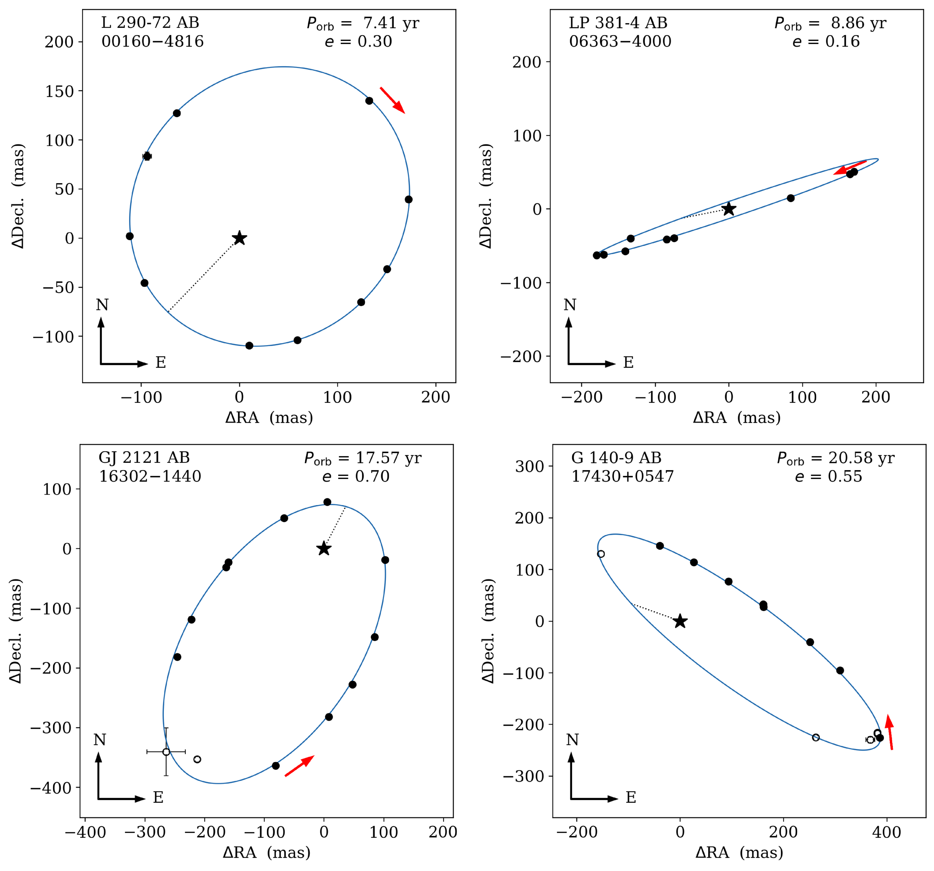 Orbits of M dwarf systems determined from the imaging data presented in Table 1. Each orbit’s parameters are given in Table 4, as fit by the code orvara (Section 4.4), to take advantage of Hipparcos data available for these cases. Point types and other plot details are the same as in Figures 3–7.