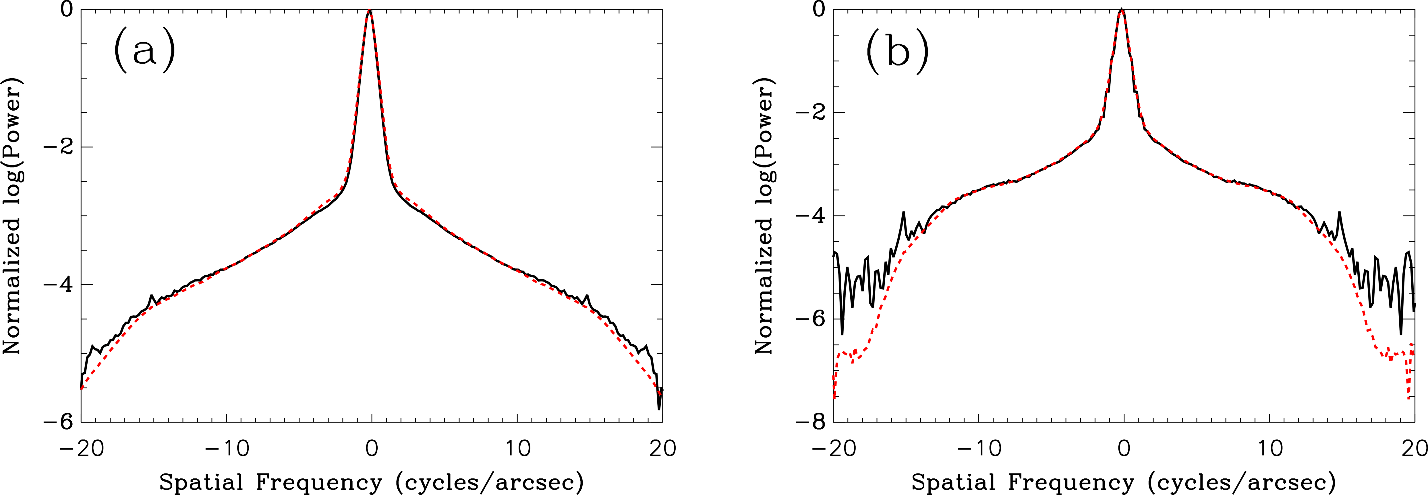 A cross section of the 2D power spectrum obtained using speckle imaging. (a) The result at 692 nm. (b) The result at 880 nm. In both plots, the solid line is the power spectrum of the unresolved star HR 5405, and the red dashed curve is the power spectrum of Arcturus. The large peak at low frequencies is caused by seeing, and in both cases, the curves are nearly identical at lower spatial frequencies, but begin to slightly diverge at the higher frequencies shown, with Arcturus having lower power in that region. Note that the curves do not extend to as high a limit for the 880 nm data because the diffraction limit is reached at a lower spatial frequency for the longer wavelength. A higher noise floor is also seen above the diffraction limit for the point source at 880 nm because it is a fainter star than Arcturus.
