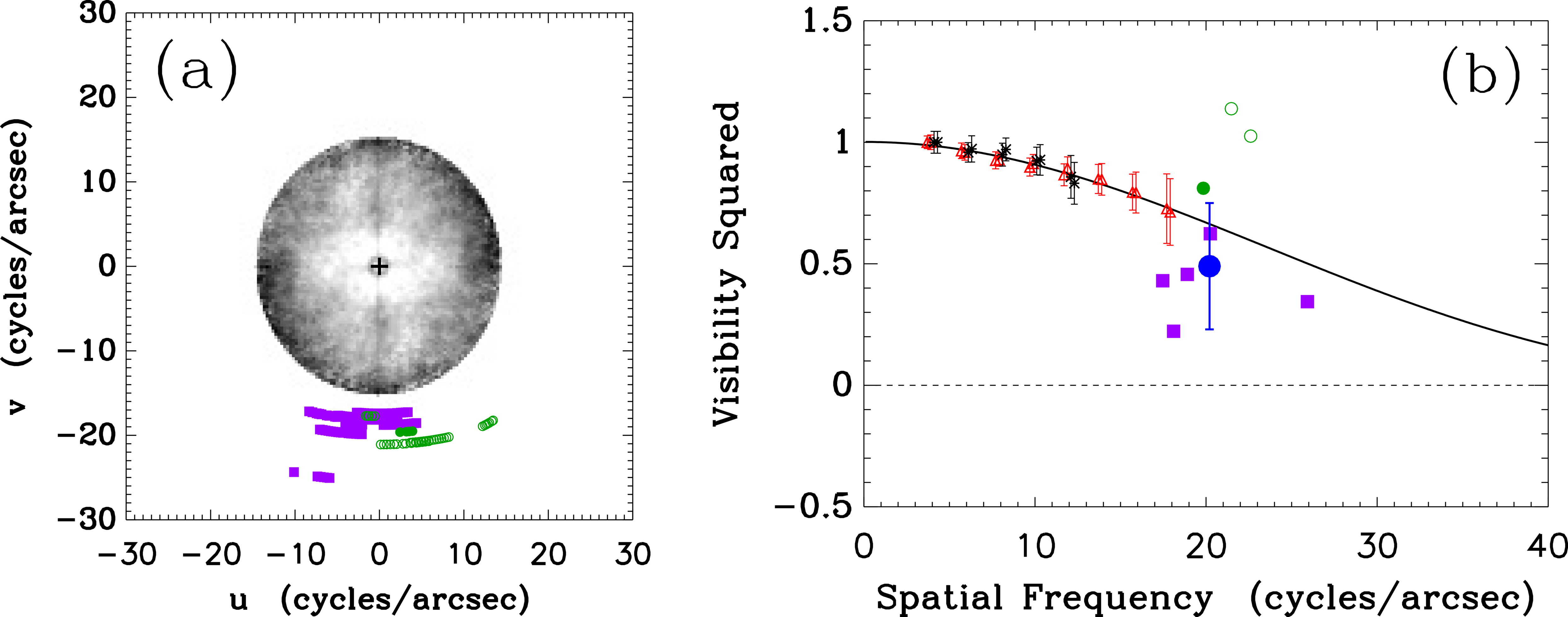 (a) The spatial frequency coverage for Arcturus. The grayscale image inside the circle represents the derived spatial frequency power spectrum for the averaged speckle data, extending out to 15 cycles arcsec–1, with darker shades near the edge of the circle indicating lower power. The cross marks the origin in the u–v plane, and the purple and green data points illustrate the observing sessions with the intensity interferometer. The color coding and symbols are the same as in Figure 7. (b) The visibility curve for Arcturus. Here, the red triangles are the radially averaged values of visibility for the 692 nm speckle data, the asterisk symbols are the 880 nm speckle data, and the blue filled circle is the summed result for the intensity interferometry data. Green and purple squares indicate the visibilities obtained for individual observing sessions, albeit with large uncertainties in each case. The colors and symbols are the same as in Figure 7, and three observations included in the final visibility measure fall outside the plot window. The solid curve is the fitted visibility as a function of spatial frequency, and the dashed curve is drawn at zero to guide the eye.