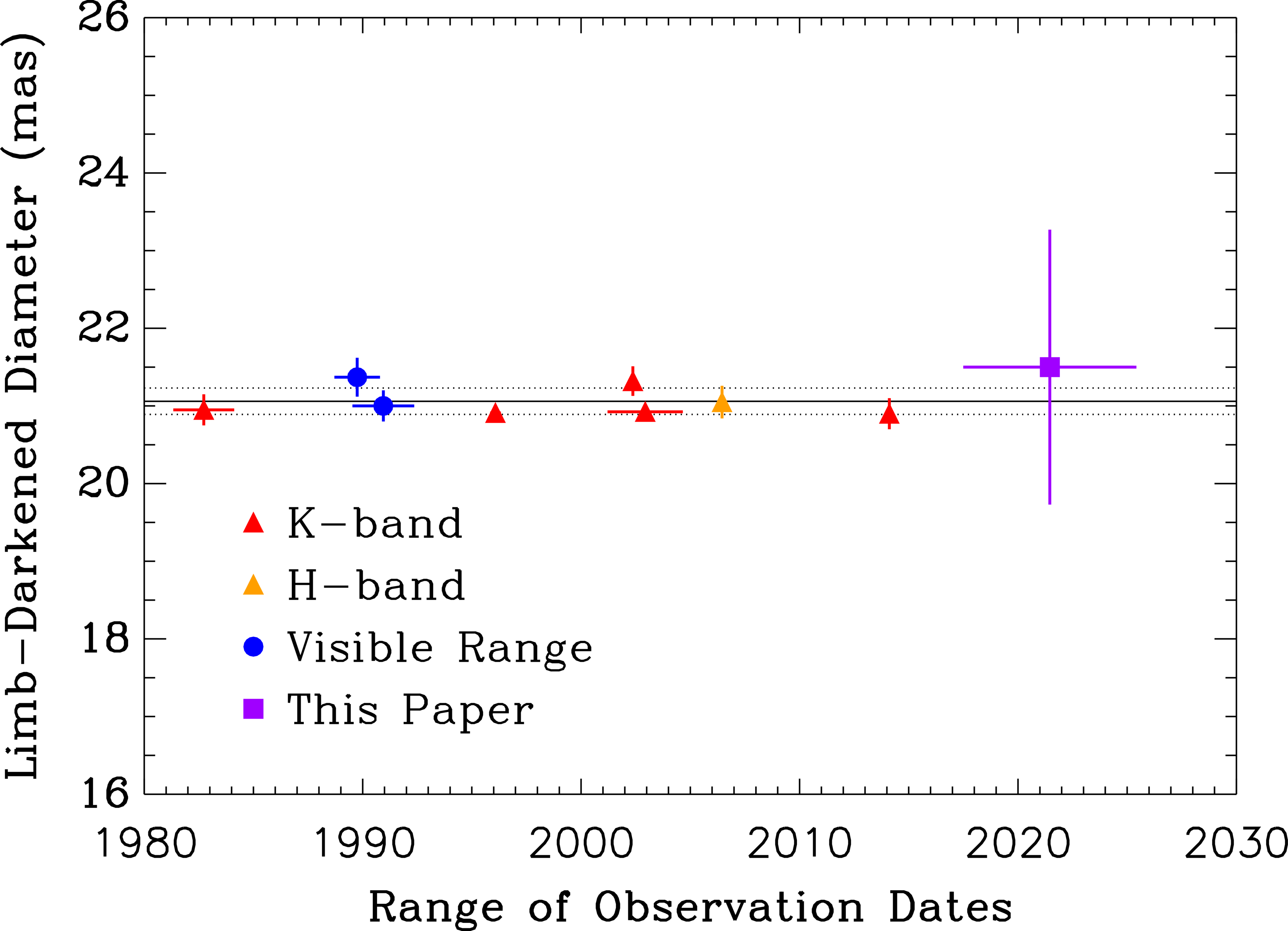 Diameter measurements of Arcturus made by various groups since 1980 using interferometric techniques. K-band measures are from I2T, IOTA, and VLTI, the H-band data point is from IOTA, the visible measures are made by the Mark III interferometer and NPOI, and the purple square indicates the measure presented here. Vertical error bars are included for all measures, and the horizontal error bars indicate the time frame over which the observations were taken in each case. For our measure, though the timeline extends from our earliest observations in 2017 to the present, most of the data are from 2025. The black solid and dotted lines indicate the weighted average and uncertainty found in I. Ramírez & C. Allende Prieto (2011), 21.06 ± 0.17 mas.