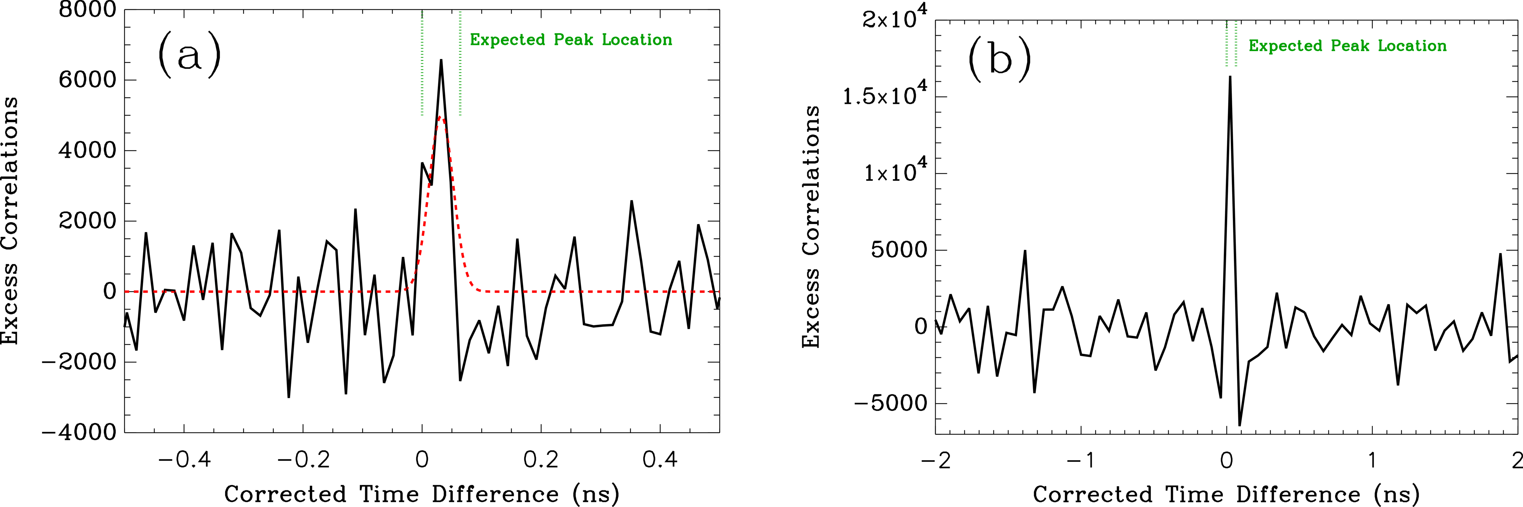 Cross-correlation results obtained on unresolved sources with SCSI to date by combining the results in Figure 4 with those from Paper I. (a) In this case, the plots are made binning the timing differences between photon pairs in 16 ps bins. The black solid curve is the data, the red dashed curve is a Gaussian fit to the data, and the green dotted lines indicate the expected locations of the peaks based on timing corrections made throughout the dataset. (b) The same data, but using a bin width of 64 ps.