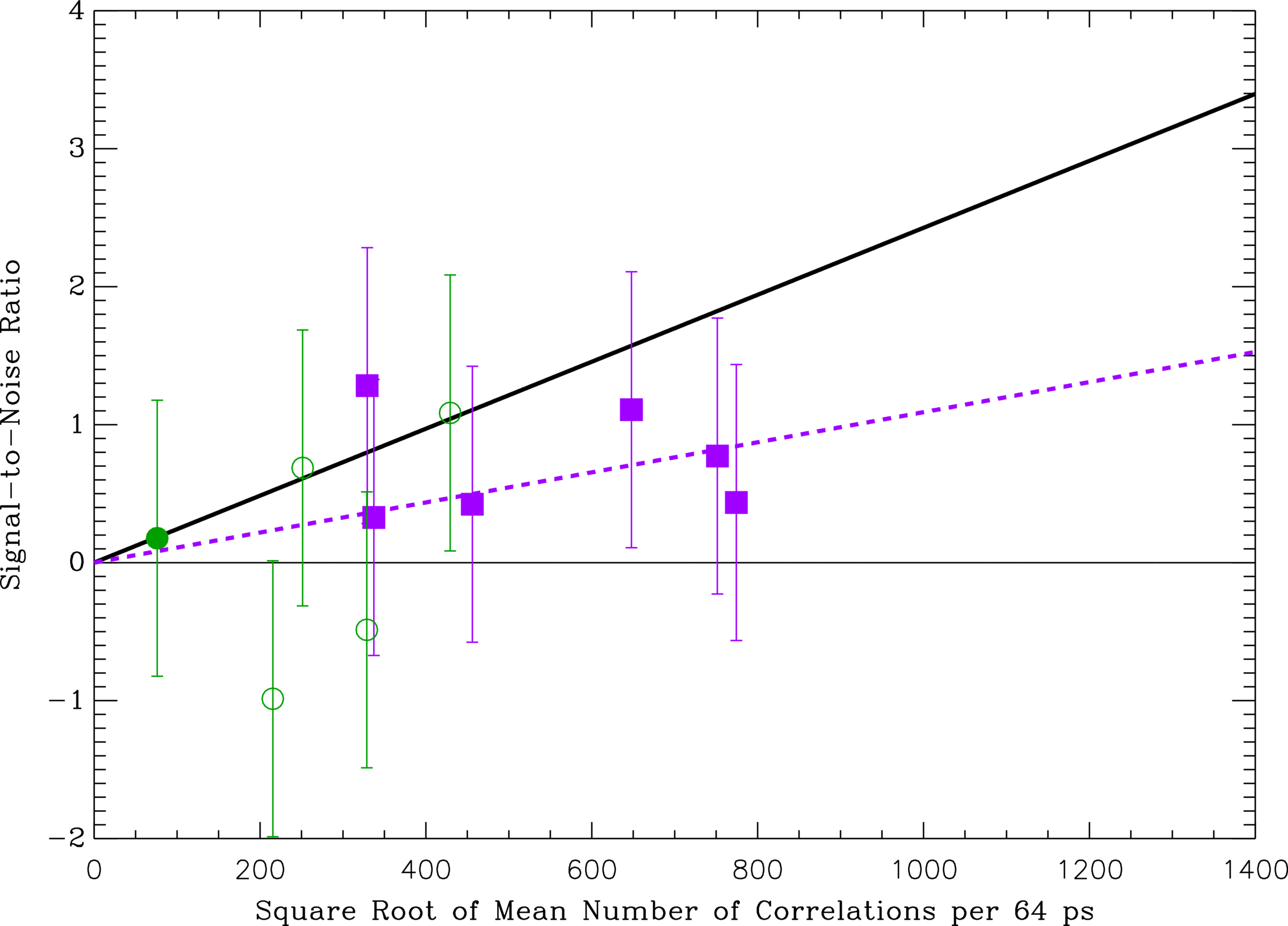 SNR obtained in the final cross-correlation function in each observing session listed in Table 2 as a function of the square root of the mean number of correlations obtained in a 64 ps timing bin. The purple squares indicate the results from Table 2, except for the 2017 June 21 data, which are shown as a solid green circle. For comparison, we also include here the data from Paper I as open green circles. Both the 2017 June 21 data and the Paper I data were obtained with a filter of central wavelength/FWHM of λ/Δλ = 532 nm/3 nm. The line of best fit from Figure 3 is shown as the solid line, the dashed purple line indicates the line of best fit for Arcturus, and the solid line at zero is presented to guide the eye.
