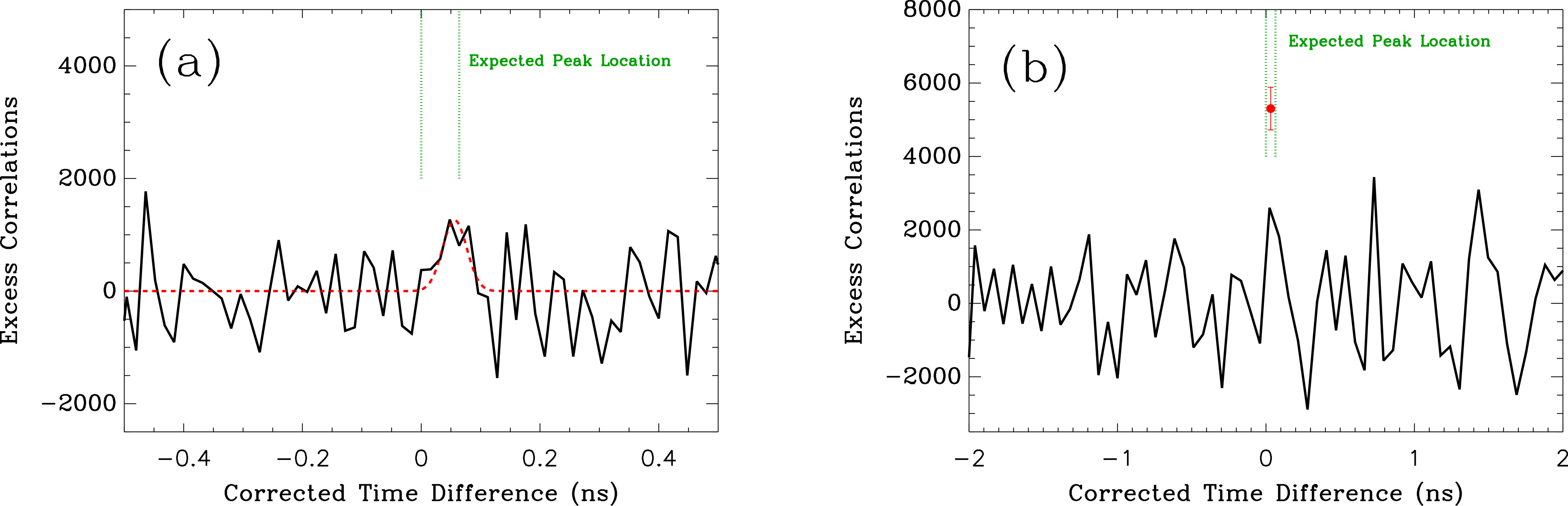 Cross-correlation results obtained on Arcturus for the dataset presented here plus the results in Paper I. (a) In this case, the plots are made binning the timing differences between photon pairs in 16 ps bins. The black solid curve is the data, the red dashed curve is a Gaussian fit to the data, and the green dotted lines indicate the expected locations of the peaks based on the timing corrections made throughout the dataset. (b) The same data, but using a bin width of 64 ps. The red filled circle indicates the signal value expected for full correlation based on the results from Vega in the previous section.