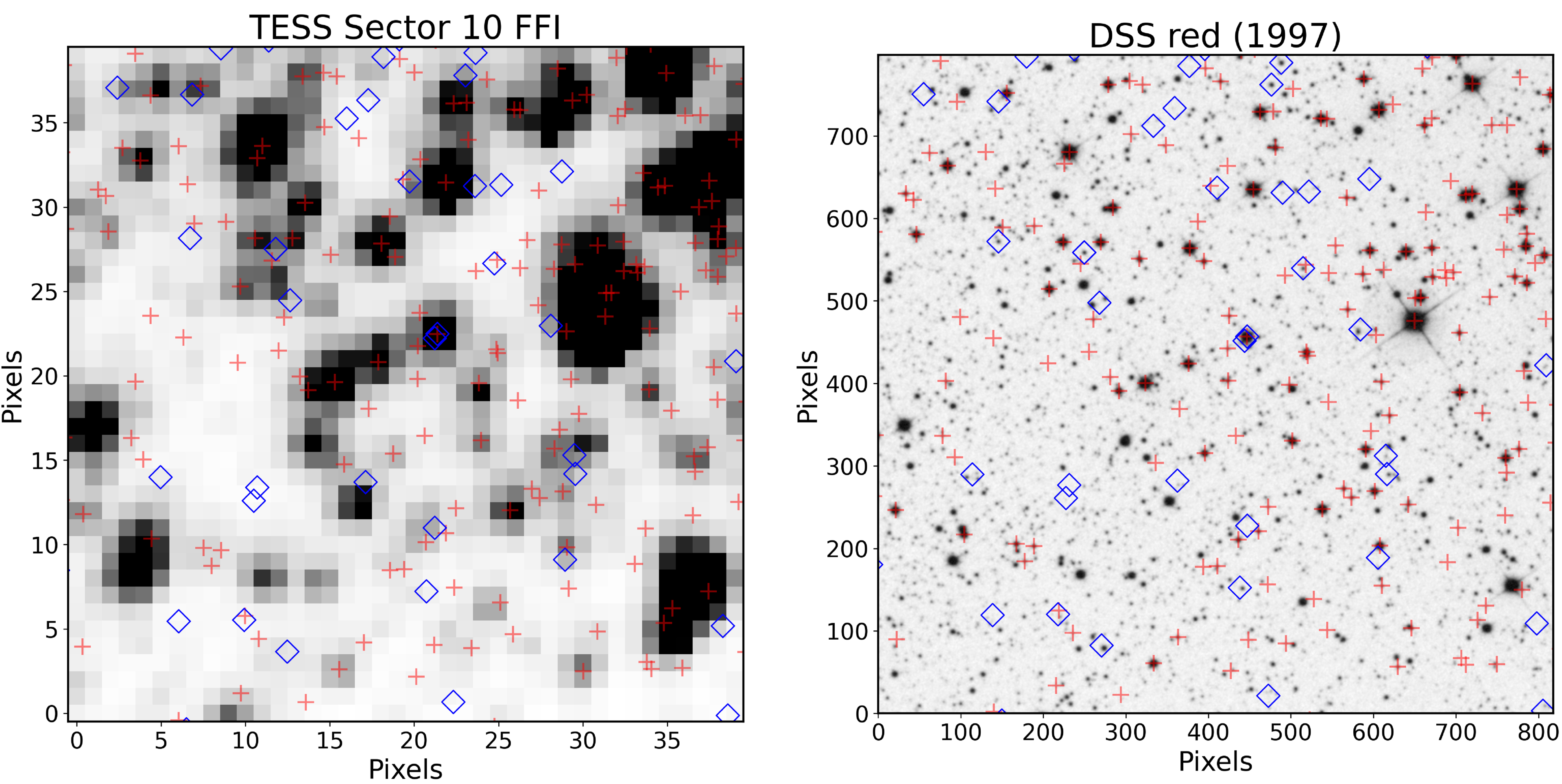 Comparison of a TESS Sector 10 FFI 40 × 40 pixel cutout (left) and ground-based Digitized Sky Survey image (right) for a representative cluster target. The red plus symbols are the 159 E. L. Hunt & S. Reffert (2023) cluster members in the image, and the blue diamonds are 32 variables included in the Gaia DR3 variability catalog (L. Eyer et al. 2023). Clearly, the TESS pixels are large enough to include contributions from several sources, including background variables.
