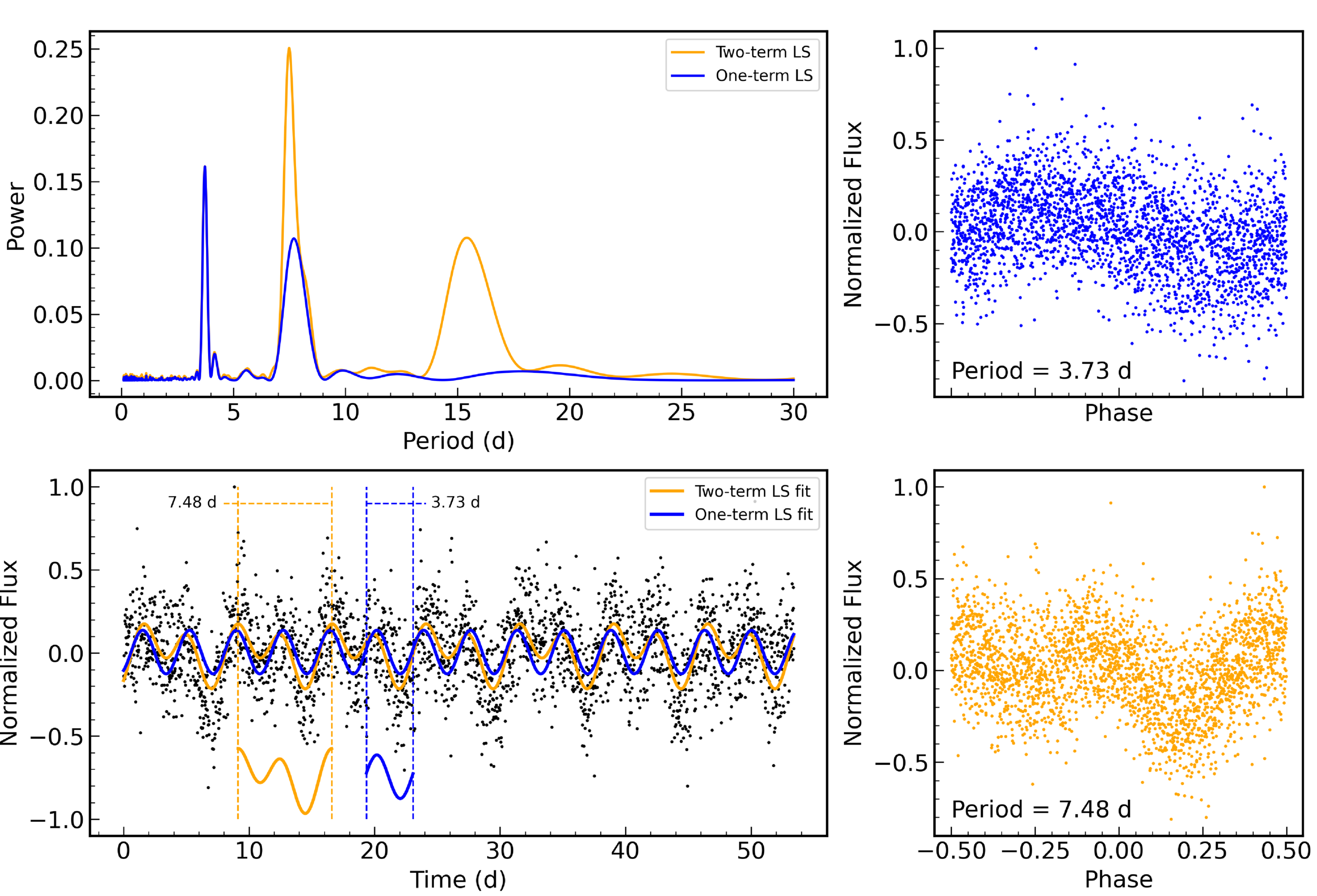 An example of a star for which using the two-term LS led to a period correction. The one- and two-term LS periodograms are shown at the top left. The corresponding best-fit LS models at the highest power period for each periodogram are plotted with the Cycle 5 light curve (bottom left). The location of the secondary peak in the one-term periodogram matches the location of the primary peak in the two-term periodogram (7.48 days). This corresponds to a Prot that is approximately double that measured using the location of the primary peak in the one-term periodogram (3.73 days). The original measurement at 3.73 days is a half-period harmonic of the true period, and was corrected to 7.48 days. The top-right panel shows the light curve phase-folded on the original Prot measurement, while the bottom-right panel shows the light curve phase-folded on the corrected measurement. The varying amplitude of the signal (i.e., the “double dipping” causing the harmonic measurement) is evident in the bottom-right phase-folded light curve, and is accurately modeled by the two-term periodogram.