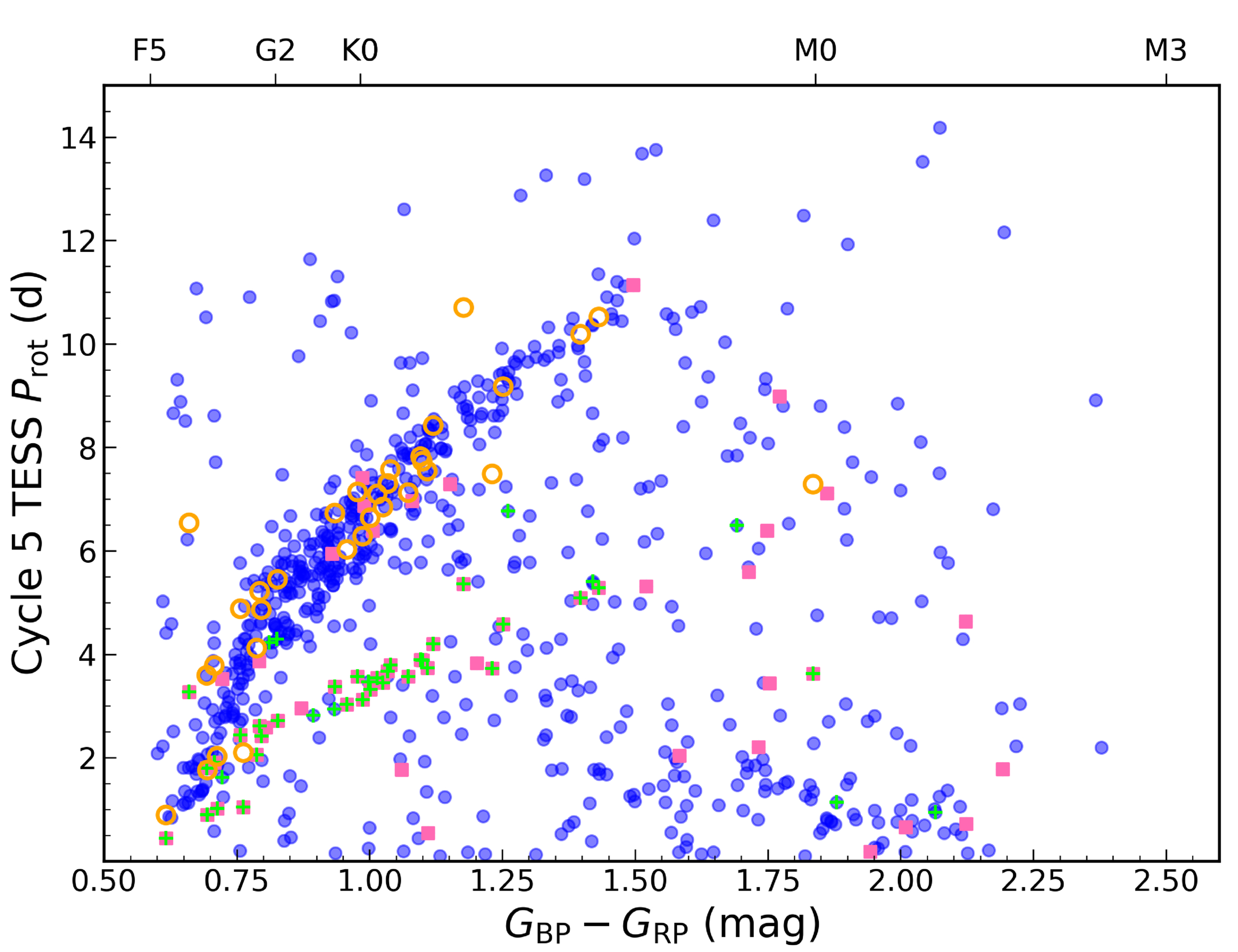 TESS Cycle 5 CPD. Stars for which we measured twice the Prot measured for Cycle 5 (using the standard LS periodogram) in a different TESS cycle are marked with a green cross. Prot measurements identified as potential harmonic measurements using a comparison between one-term and two-term LS periodograms are marked with pink squares. Where both these criteria are met for a given Prot measurement, we replaced our original measurement with the two-term LS measurement. The corrected measurements are marked with orange circles.