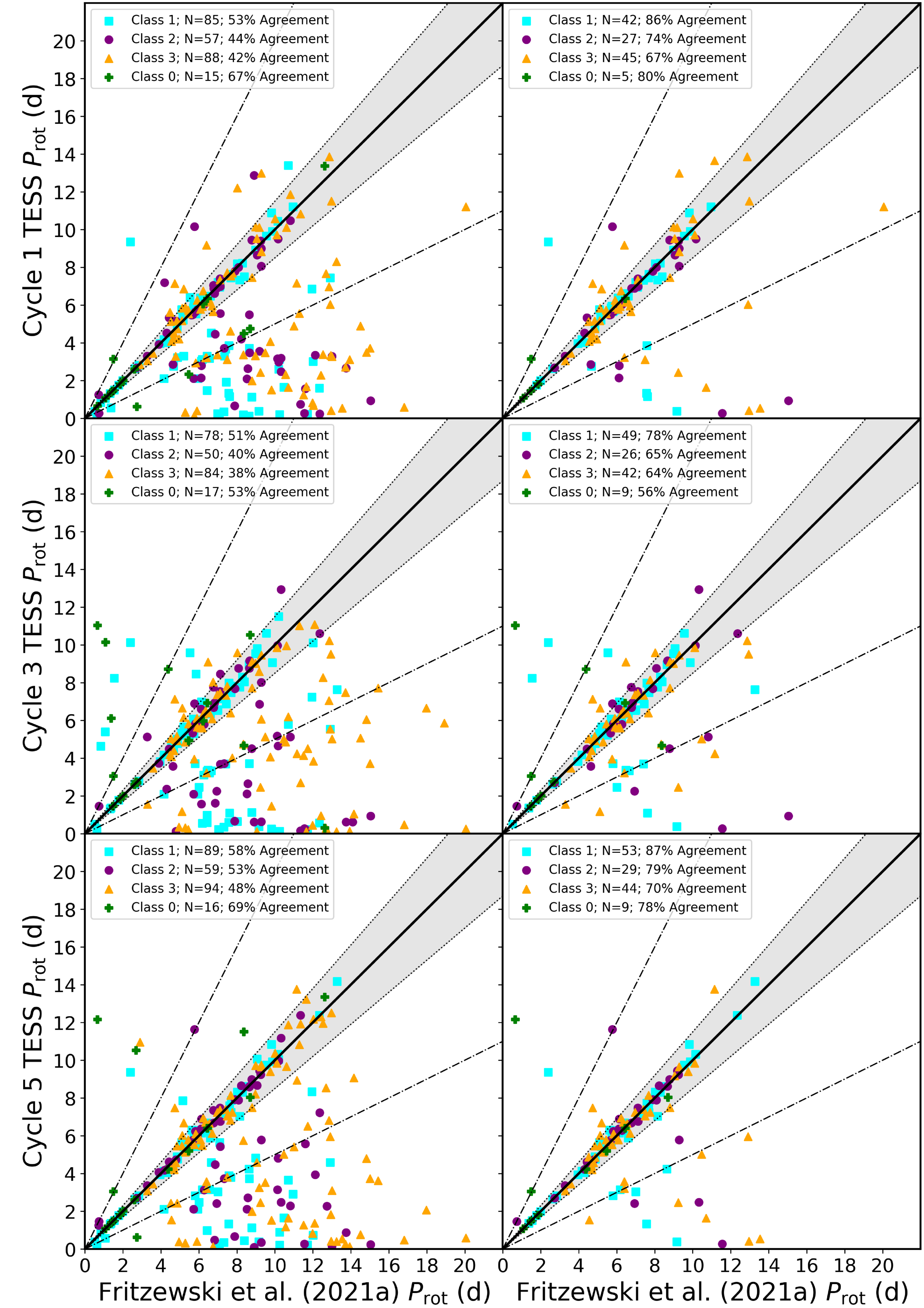Comparisons of the Prot measured using TESS light curves from Cycles 1, 3, and 5 with those from D. J. Fritzewski et al. (2021a), before (left) and after (right) our analysis removing our erroneous measurements. The shaded region indicates a difference of ≤15% between the TESS and literature Prot values, which we take to be an agreement in the measurements. We also include 2:1 and 1:2 lines to indicate possible harmonic or subharmonic measurements. The classification assigned to each Prot measurement in D. J. Fritzewski et al. (2021a) is indicated with a different symbol. Even before analyzing our results, we have a high Prot recovery rate (50%–60%) for the high-confidence (class 1) measurements from D. J. Fritzewski et al. (2021a), shown as filled cyan squares. Our initial agreement rate for lower-confidence measurements—especially those obtained using activity as a prior (class 3; filled orange triangles)—is systematically lower (≈40%–50%). Our analysis of cases where our measurements differ significantly from those of D. J. Fritzewski et al. (2021a) allows us to improve our recovery rate, so that it reaches ≳80% for the class 1 Prot, while the other classes of Prot measurements saw slightly smaller improvements in agreement rate.
