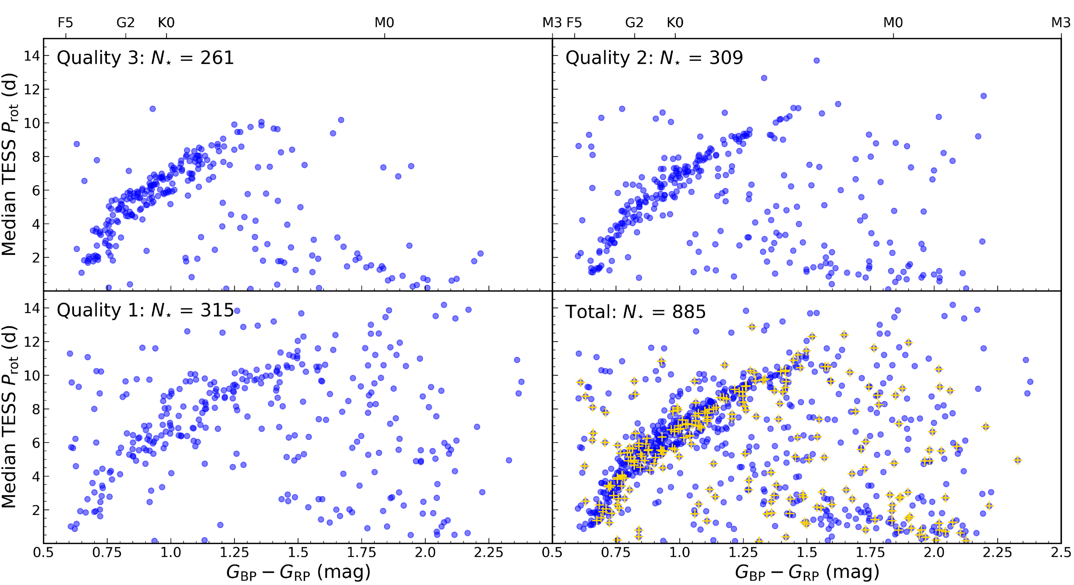 CPDs for NGC 3532 based on quality classification of the final Prot measurement reported for each star. Measurements classified as Quality 3 represent our highest-confidence Prot, where the measured period was consistent across all three TESS cycles. Quality 2 Prot are measurements that agreed in two TESS cycles, and Quality 1 Prot were measured in only one cycle, corresponding to the longest Prot measured in cases where measurements in multiple cycles disagreed. In total, we make new Prot measurements for 885 stars, all of which are plotted in the bottom-right CPD. The yellow crosses in that CPD correspond to the 228 stars with HDBSCAN membership probabilities of <50% as indicated by E. L. Hunt & S. Reffert (2023) and for which we make new Prot measurements. Many of these lower-probability members fall on the slow-rotating sequence, suggesting that they are a part of the coeval NGC 3532 population and are likely cluster members.
