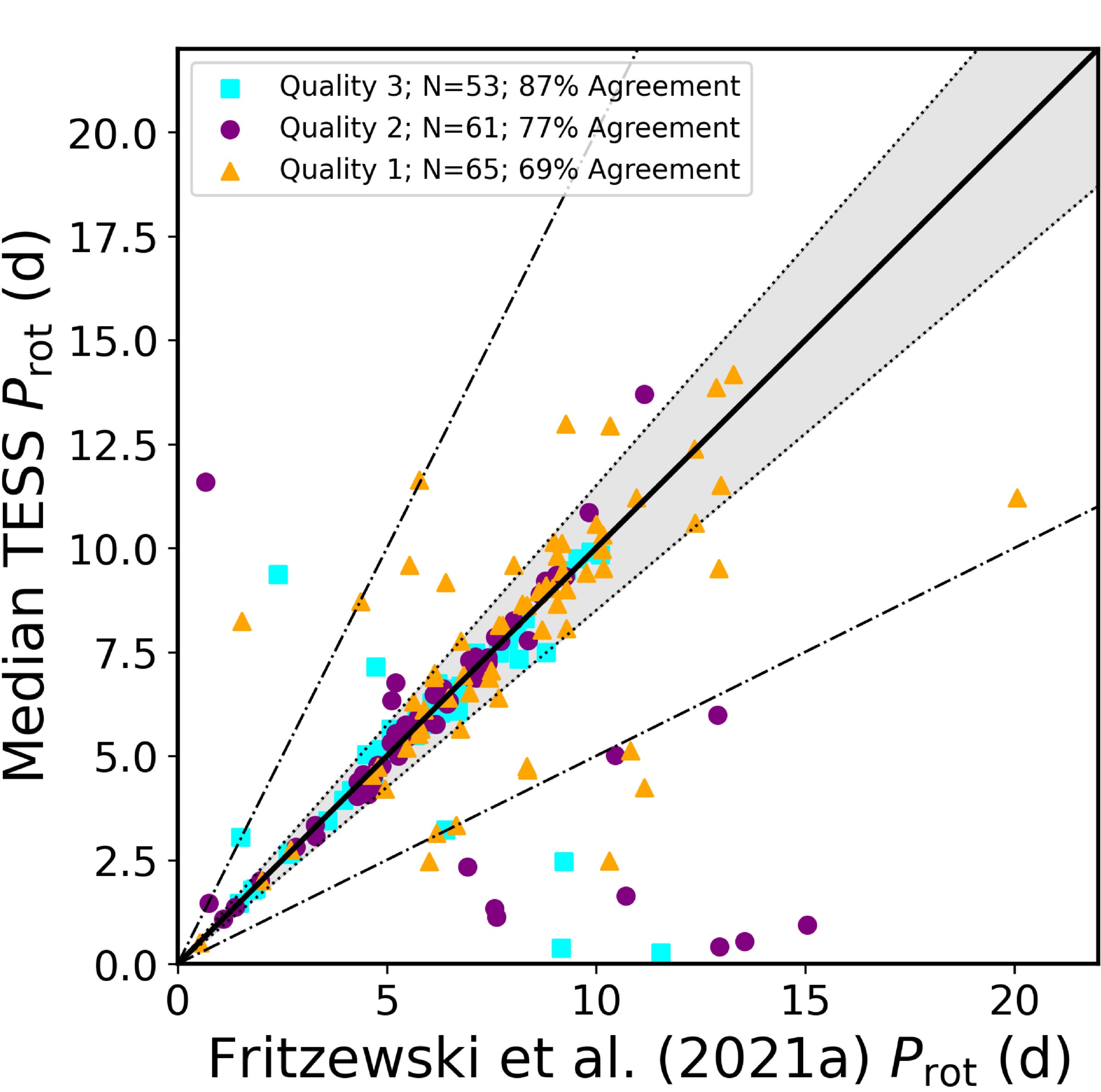 Comparison of our final Prot measurements with those from D. J. Fritzewski et al. (2021a). Different symbols indicate the quality classifications assigned to our Prot measurements. Our higher-confidence Prot measurements, which are validated with observations from multiple TESS cycles (filled cyan squares, three cycles; filled purple circles, two cycles) have higher agreement rates with the measurements from D. J. Fritzewski et al. (2021a).