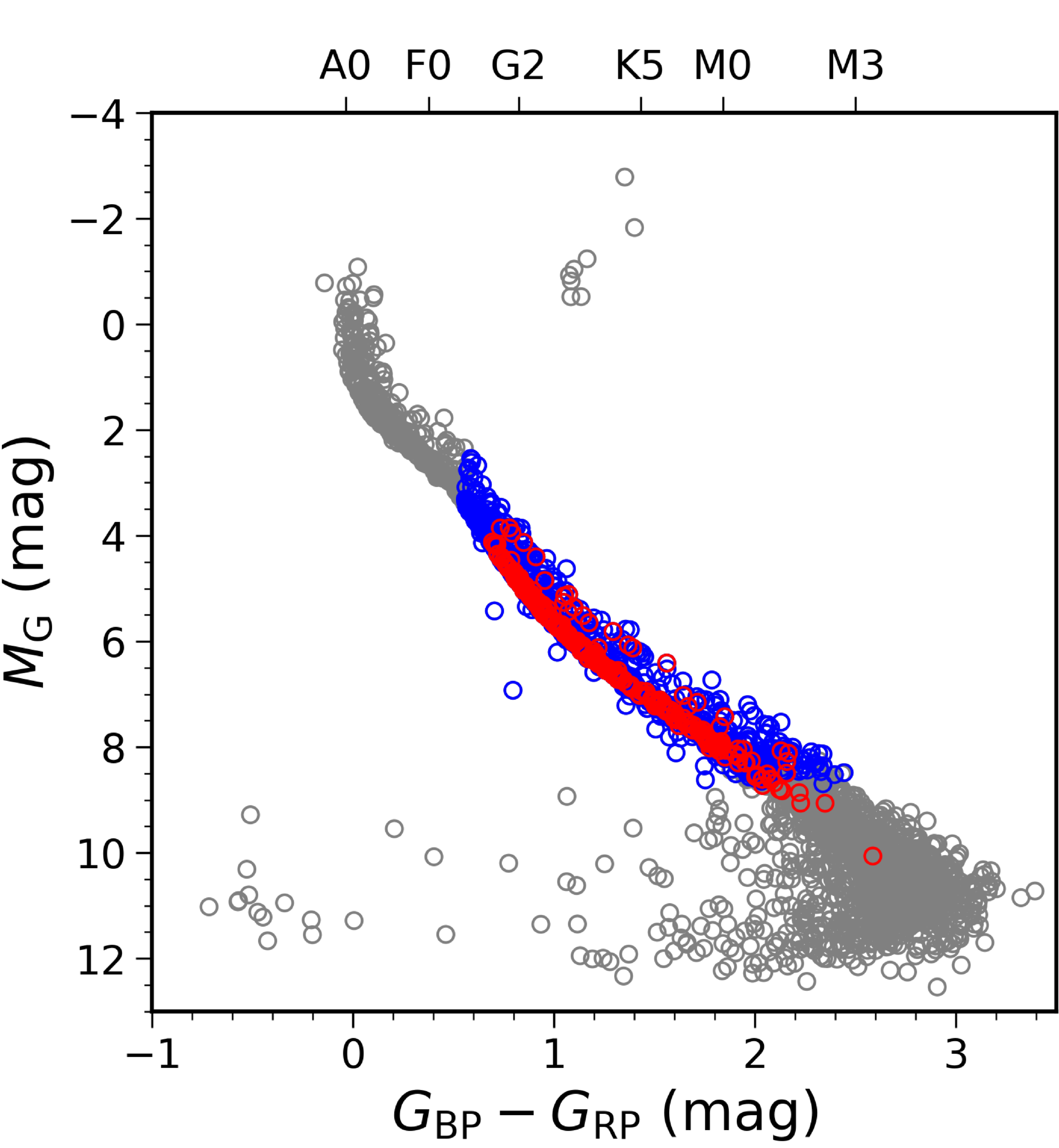 Gaia CMD for NGC 3532 based on the E. L. Hunt & S. Reffert (2023) catalog of 3414 members. The absolute magnitudes were calculated using inverted Gaia DR3 parallaxes; we applied a reddening AV = 0.093 mag (J. D. Cummings & J. S. Kalirai 2018). The red circles are the 276 stars in the E. L. Hunt & S. Reffert (2023) catalog with D. J. Fritzewski et al. (2021a) Prot measurements. The blue circles are the 1358 low-mass, main-sequence cluster members for which we have TESS light curves and that met our selection criteria for making new Prot measurements.