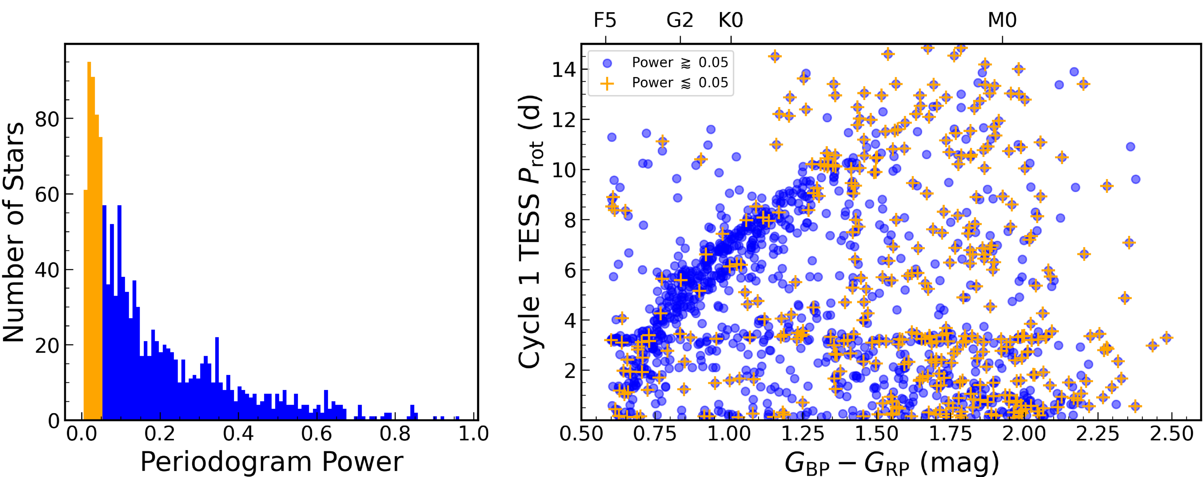 The impact on the Cycle 1 Prot distribution of requiring a minimum power when validating Prot measurements. The left panel shows a histogram of the periodogram powers for the Cycle 1 light curves; the orange bins correspond to powers below the 30th percentile for this dataset (0.05 in this case). The right panel shows the full distribution of Cycle 1 Prot, with the values drawn from measurements with a power below the 30th percentile indicated with orange crosses. Those low-power measurements include many outliers, such as the K stars with Prot > 10 days or <1 day, and other problematic measurements, such as the strip of ≈3 days Prot across the observed color range.