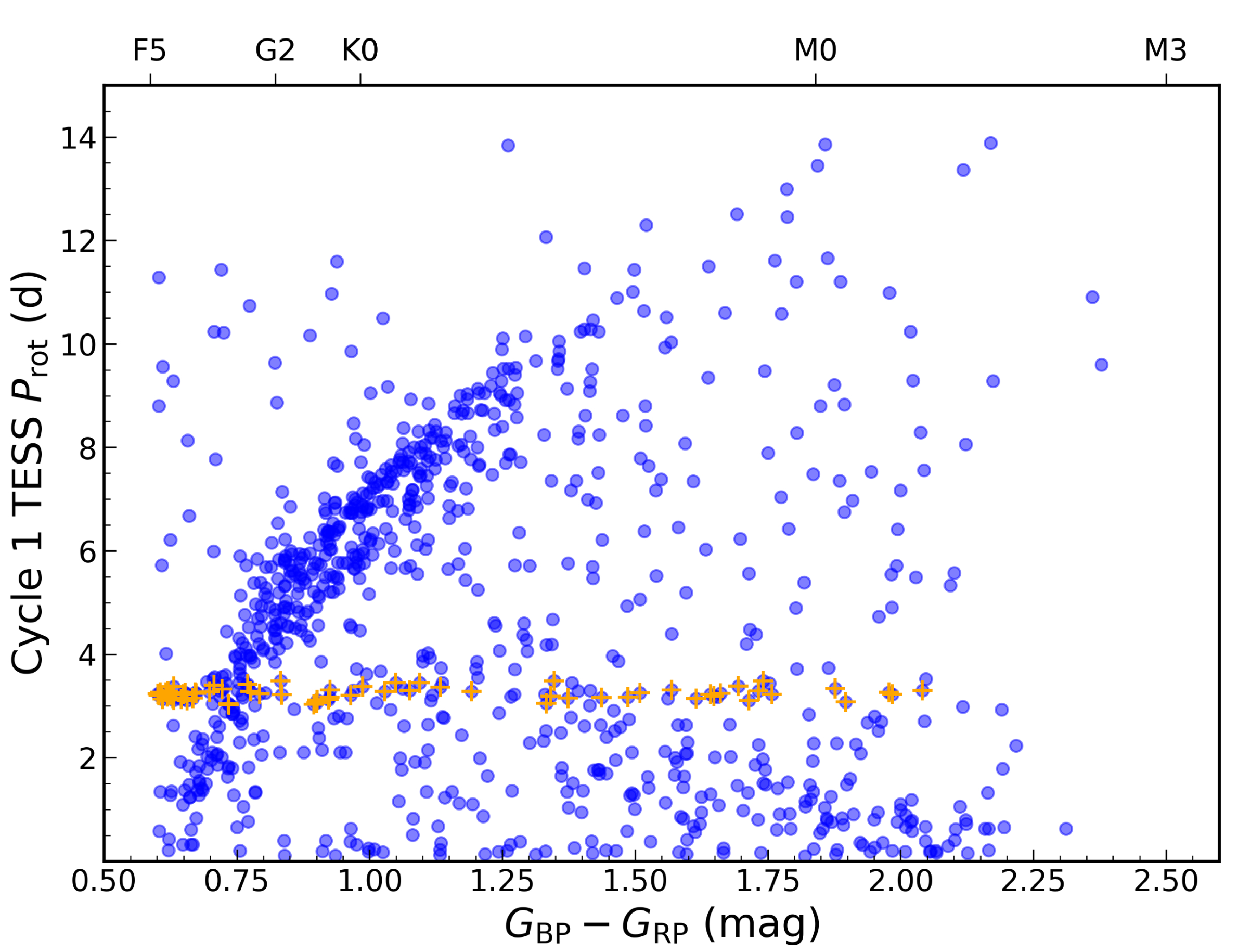 TESS Cycle 1 CPD depicting our identification of Prot measurements that are the result of systematic errors. Measurements of Prot < 15 days with periodograms powers greater than the 30th percentile power for this cycle are plotted as blue circles. Prot measurements ranging from 3.0 to 3.5 days with periodogram powers <0.1 are marked with orange crosses and are likely the result of an (unspecified) systematic error in the Cycle 1 data. Setting a Prot range and raising the minimum power required for consideration allows us to remove a number of unreliable measurements missed with the cut illustrated in Figure 4.