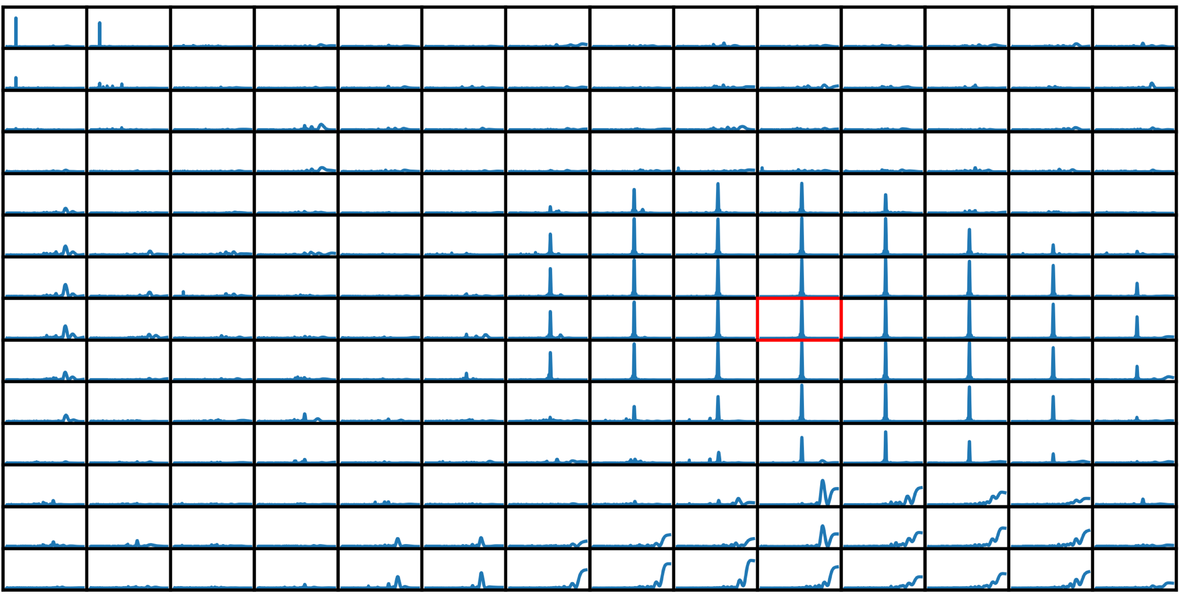 Periodograms produced for the light curves shown in Figure 7. X-axes are logarithmically spaced periods and y-axes are periodogram powers. The periodogram for the pixel hosting Gaia DR3 5340164256296564736 is highlighted with a red frame. The impact of this bright Cepheid on measurements from neighboring pixels is very evident, with its 2.1 days signal being the strongest signal measured in periodograms corresponding to pixels as far removed as ﹩\approx 1^{\prime} ﹩.