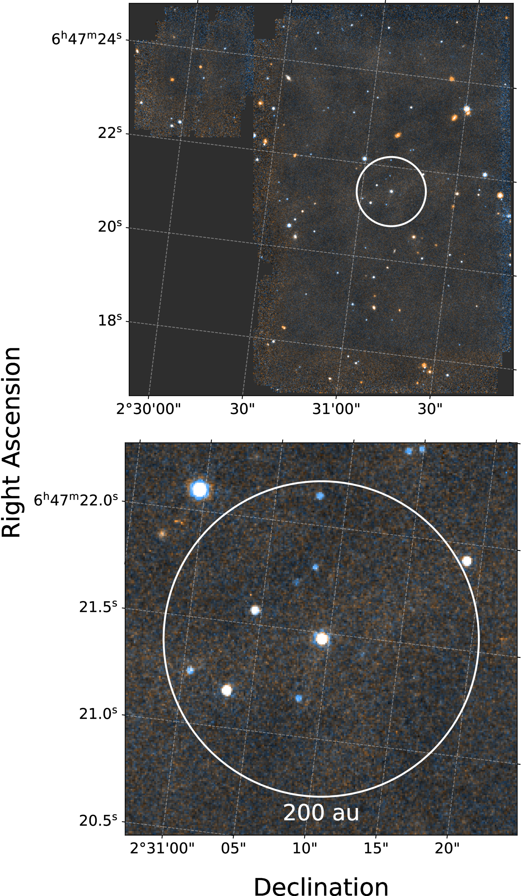 A squared-stretch false-color image of WD 0644+025, constructed from F1000W (blue), F1500W (red), and a green channel formed from the average of the two bands. The top panel displays the full MIRI field, and the bottom panel shows a magnified view centered on the target. The white circle marks a projected radius of 200 au. No resolved point-source candidates are identified within this region.