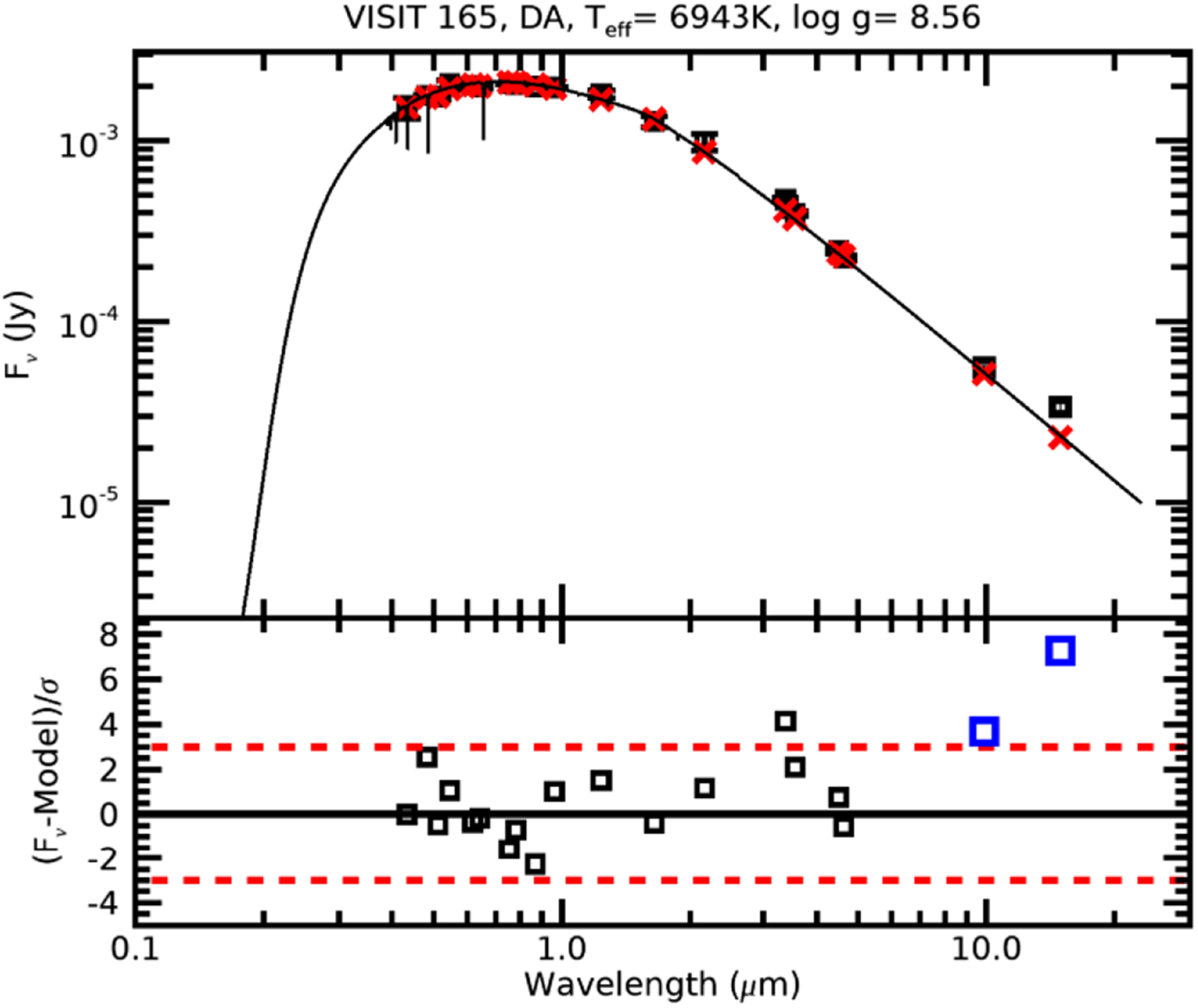 Top: the measured SED of WD 0644+025 (black squares) compared to a DA cooling model with Teff = 6943 K and ﹩{\mathrm{log}}g﹩ = 8.56 (red squares). Bottom: the residuals between modeled and observed photometry in units of sigma. The observed JWST MIRI photometry is shown with blue squares, and archival photometry is shown with black squares. The red dashed line denotes a 3σ deviation from the model. The observed JWST MIRI photometry exceeds the expected photospheric flux by 3.6σ in F1000W and 7.3σ in F1500W.
