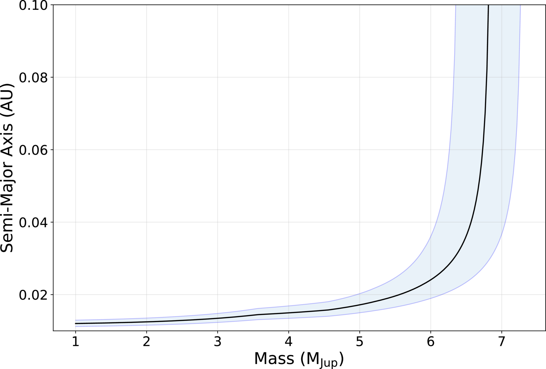 Orbital distance as a function of companion mass consistent with the observed mid-infrared excess under the combined intrinsic and insolation heating model (Equations (1) and (2)). The black curve shows the best-fit solution corresponding to Teff,pl = 261 K, while the blue curves and shaded region indicate the range spanned by the 1σ bounds (Teff,pl = 252, 270 K).