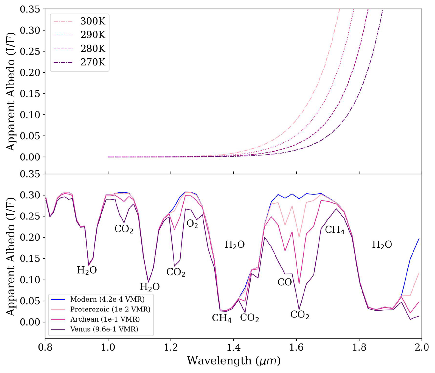 Illustrates the balancing act of keeping thermal noise minimal while maximizing the detectability of spectral features like CO2 and CO. The top plot shows the relative noise based on varying telescope temperature between 0.8 and 2.0 μm. The bottom plot shows spectral features from 0.8 to 2.0 μm of H2O, CH4, O2, CO, and CO2. We plot a modern-Earth spectra using the Planetary Spectrum Generator (PSG) with four varying CO2 abundances: Modern (4.2 × 10−4 VMR) in dark blue, Proterozoic-like (1 × 10−2 VMR) in light pink, Archean-like (1 × 10−1 VMR) in magenta, and Venus-like (9.6 × 10−1 VMR) in purple. The figure plots wavelength (μm) on the x-axis and apparent albedo (I/F) on the y-axis.