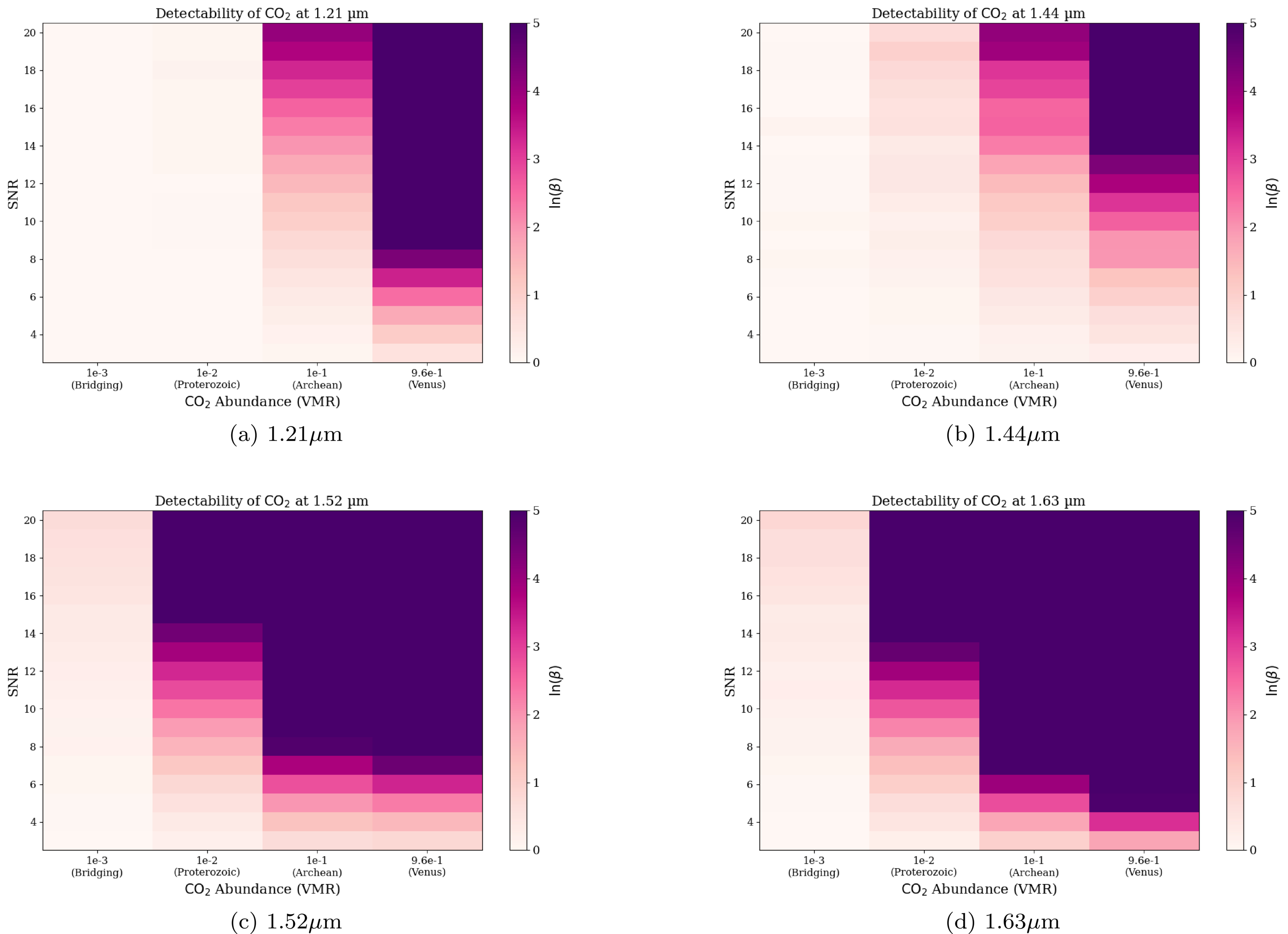Strength of CO2 detections at (a) 1.21 μm, (b) 1.44 μm, (c) 1.52 μm, and (d) 1.63 μm with respect to CO2 abundance and SNR assuming a 20% bandpass. Columns on the x-axis are different CO2 abundances: Bridging, Proterozoic-like, Archean-like, and Venus-like, from left to right. SNR values are on the y-axis. The strength of detection is shown for each combination of CO2 abundance and SNR. As indicated by the color bar on the right side of each heat map, the darker the purple is, the stronger the detection is, and the lighter the pink is, the more unconstrained the detection is, following the same lnB classifications defined in Table 2.