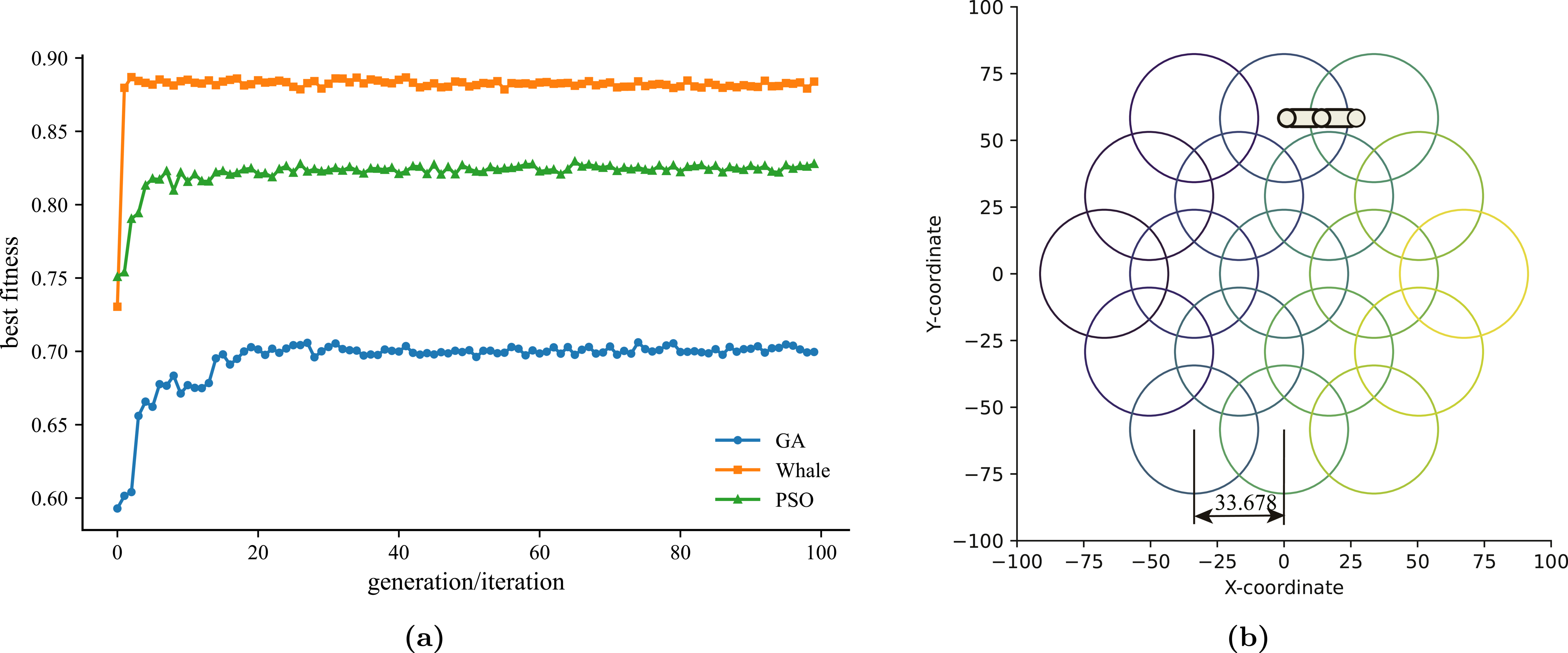 (a) Schematic representation of the fitness evolution during optimization for determining the optimal R, pitch, and central arm length. (b) This distribution map shows the best results when changing the central arm length, the R, and the pitch.