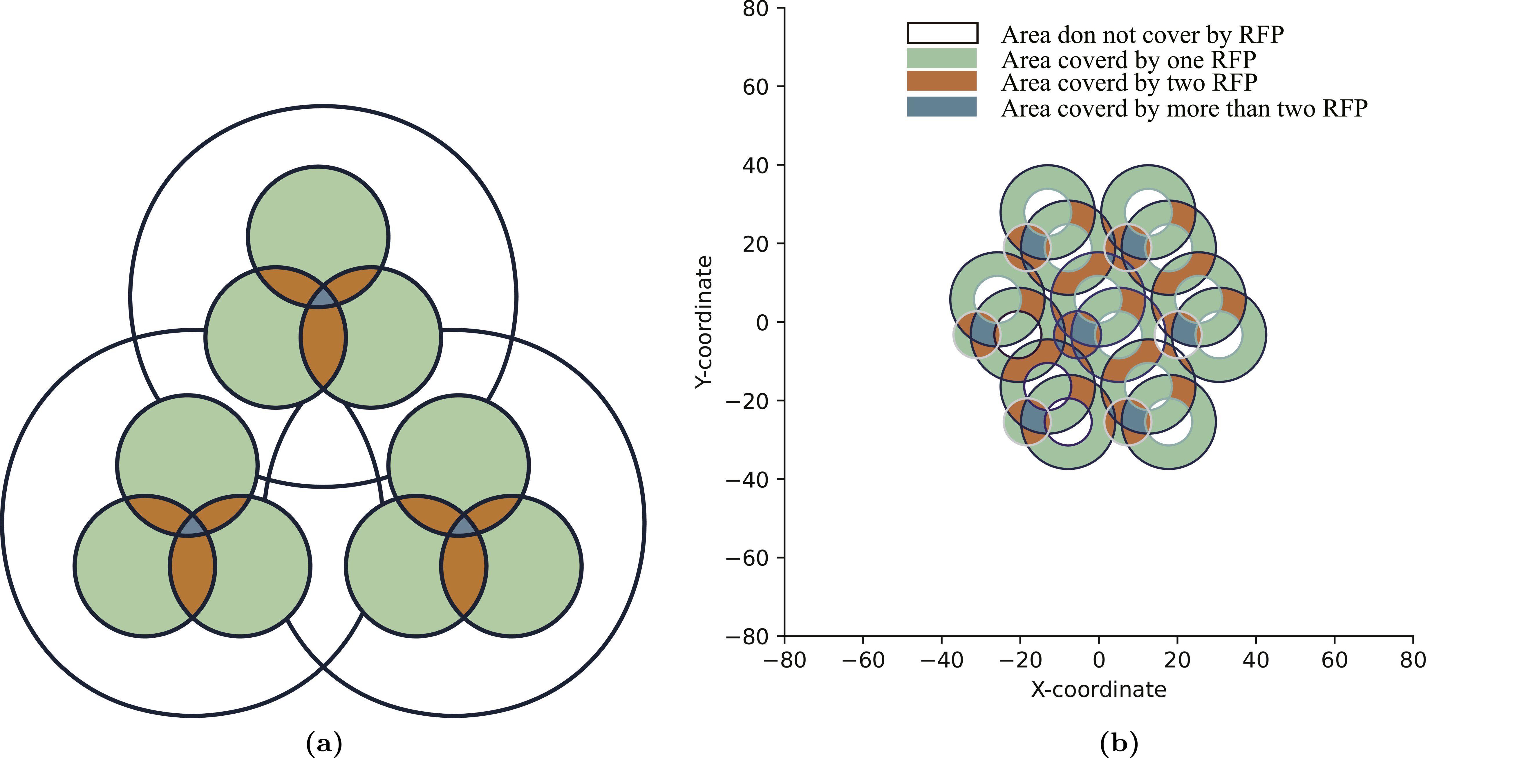 (a) Schematic diagram of a new-generation RFP insertion into a large positioner hole with partial coverage. The two colors (blue and orange) represent the conflict areas. The outer circle represents the pre-existing range of motion of the RFP. (b) This figure presents the optimized result of using new-generation RFPs to replace the original RFPs for full coverage (for a clearer view, only seven RFPs are shown).