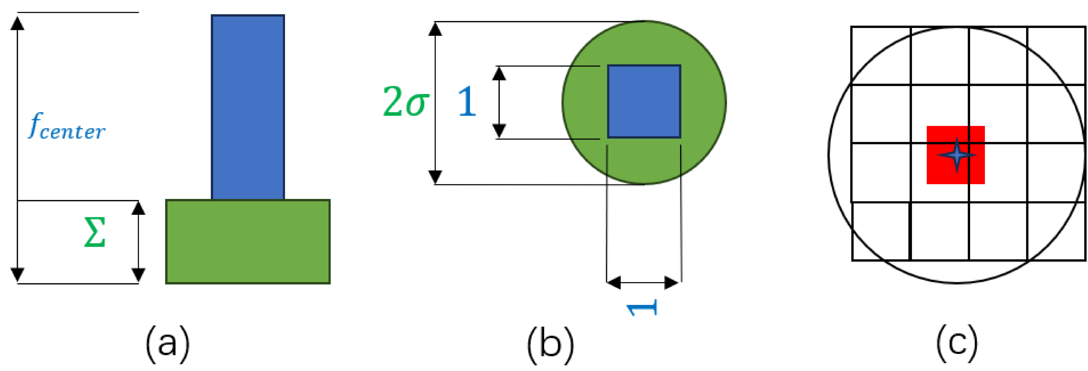 (a) Schematic side view of a faint source showing the peak flux and its surrounding region. (b) Top view of the faint source. Panels (a) and (b) facilitate the interpretation of Equations (7) and (8), highlighting the peak flux fcenter (blue) and the flux surface density σ (green). (c) Spatial relationship between the 1 × 1 pixel region used for peak flux calculation (red) and other pixels of the detected source.