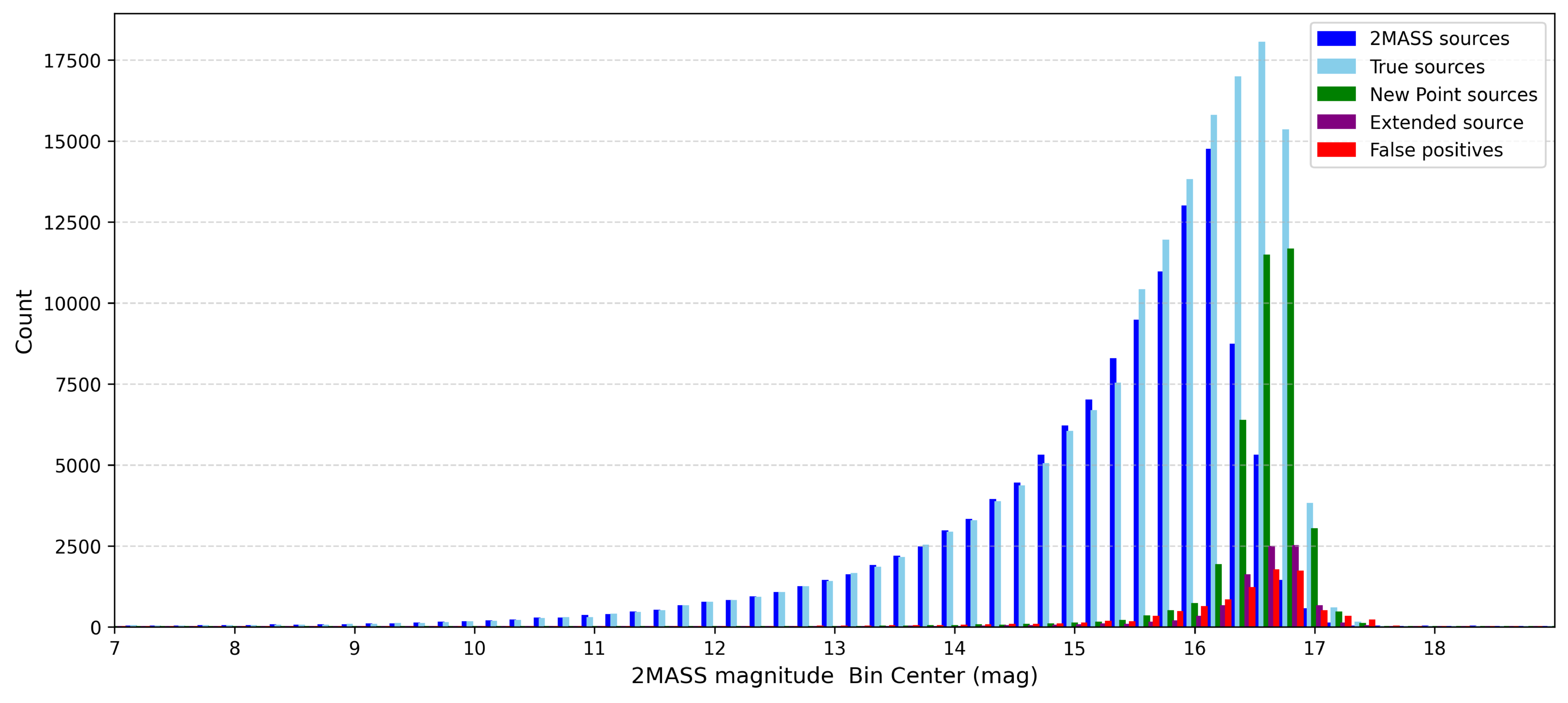 Distribution of different source categories across 2MASS magnitude bins in the test set. Each grouped bar chart comprises five distinct color-coded categories: point sources from the PSC (dark blue); all confirmed sources (light blue); new confirmed point sources (green); extended sources (purple); and false positives (red). All magnitude bins have a fixed width of 0.2 magnitudes. The horizontal axis represents the median values of the 2MASS magnitude bins, while the vertical axis indicates the number of corresponding detected sources in each bin.
