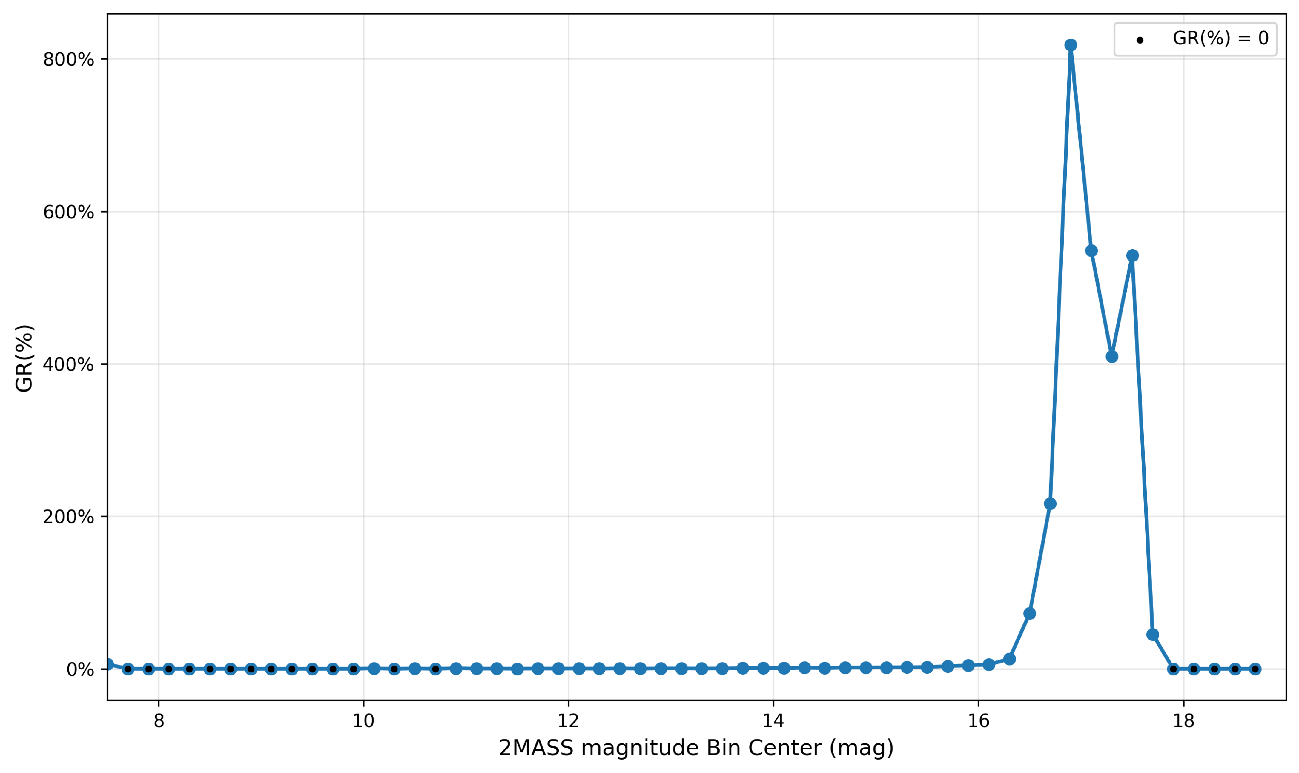 Variation of point source growth rate across 2MASS magnitude bins in the test set. The horizontal axis follows the same convention as in Figure 8, and the vertical axis shows the growth rate. The black dots mark the positions where the growth rate GR(%) equals zero.