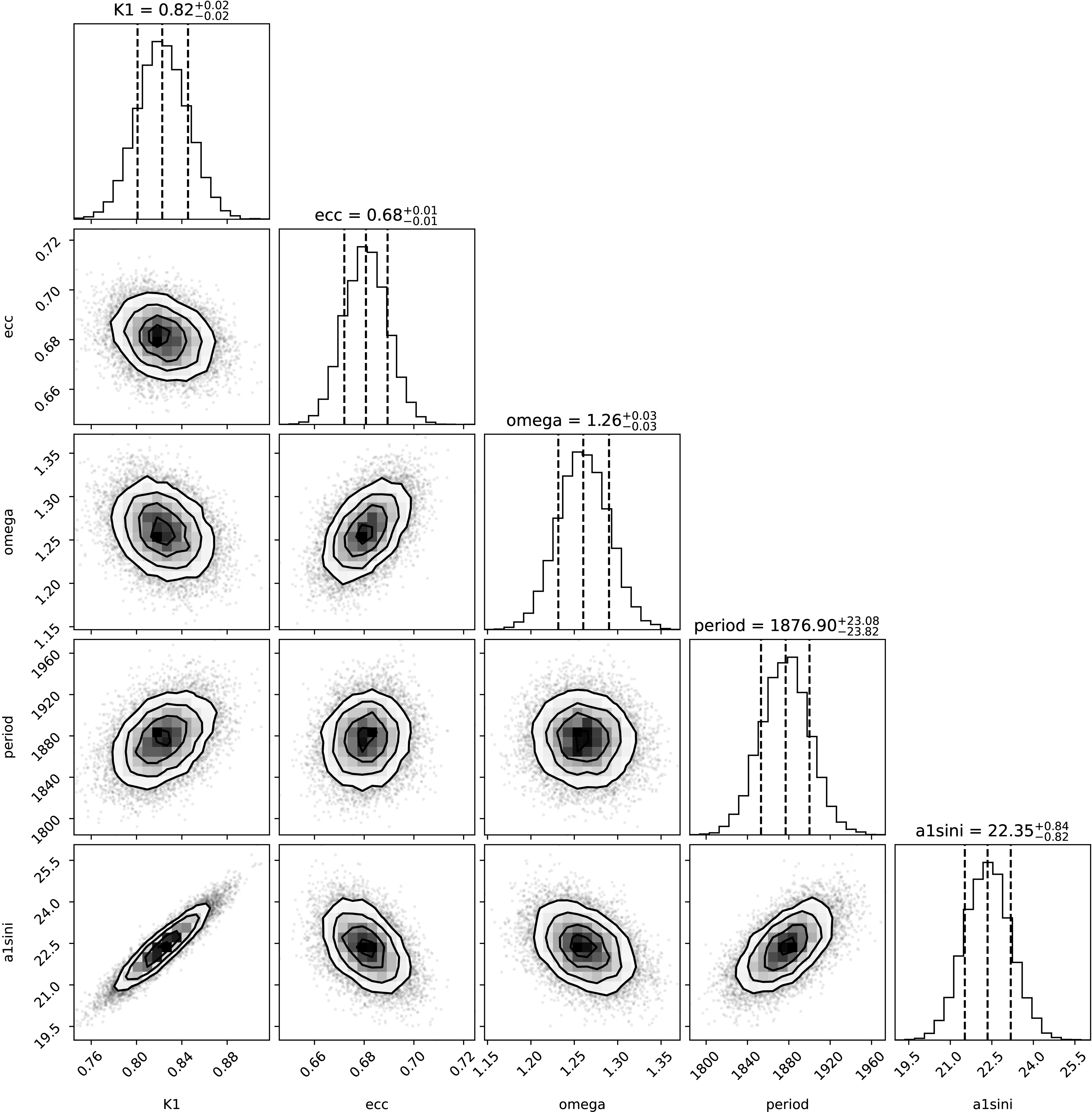 Posterior distributions obtained for NLTT 43564, which was solved as a single-lined binary.