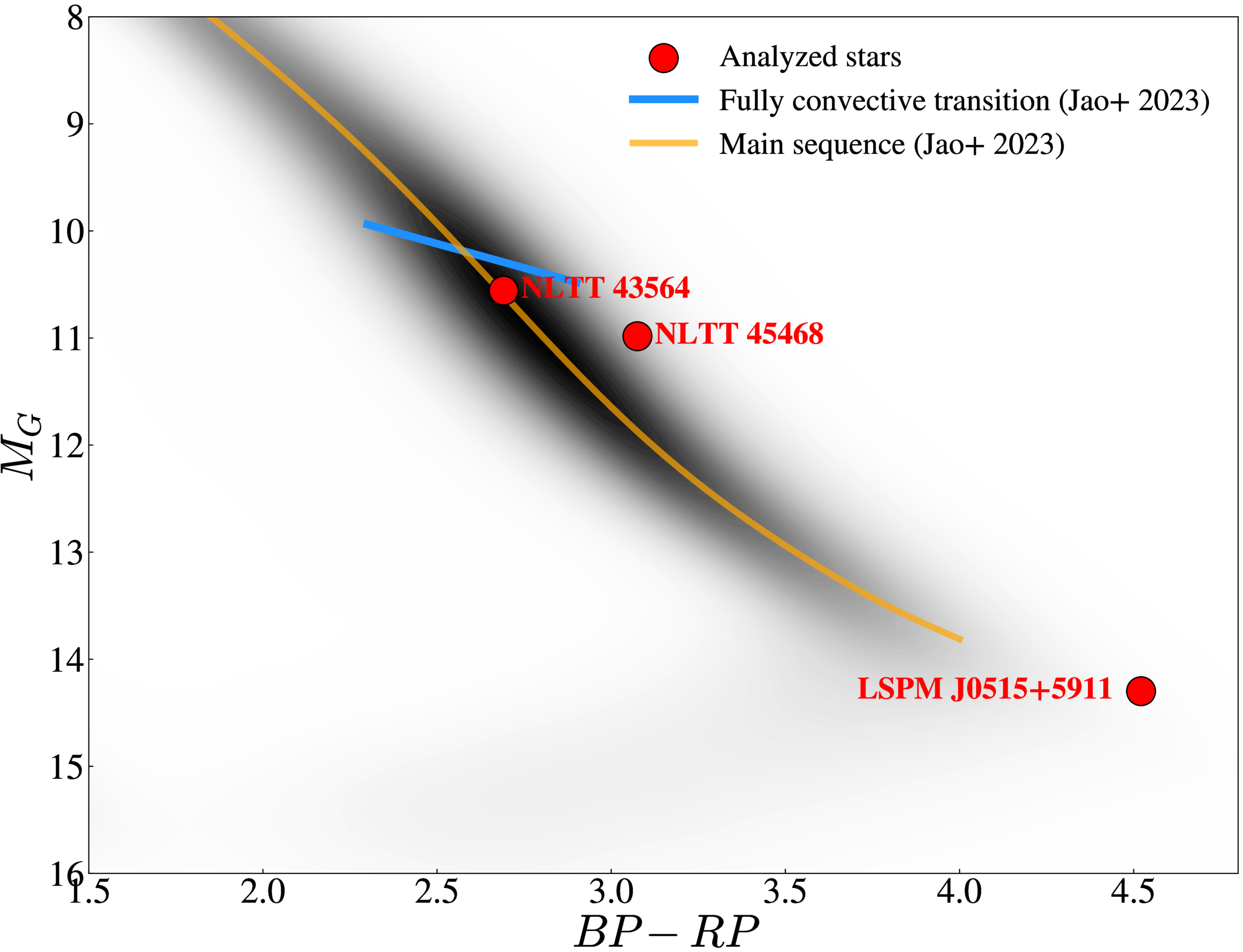 Color–magnitude diagram for nearby stars (within 100 pc) showing the local main sequence in MG vs. BP − RP. The background density map is constructed from the Gaia Catalog of Nearby Stars (Gaia Collaboration et al. 2021). The three analyzed binary star targets, LSPM J0515+5911, NLTT 45468, and NLTT 43564, are plotted as red markers and they include light from the unresolved companion as seen by Gaia. The blue line indicates the observational transition to fully convective M dwarfs and the orange curve shows the empirical main-sequence points from W.-C. Jao et al. (2023).