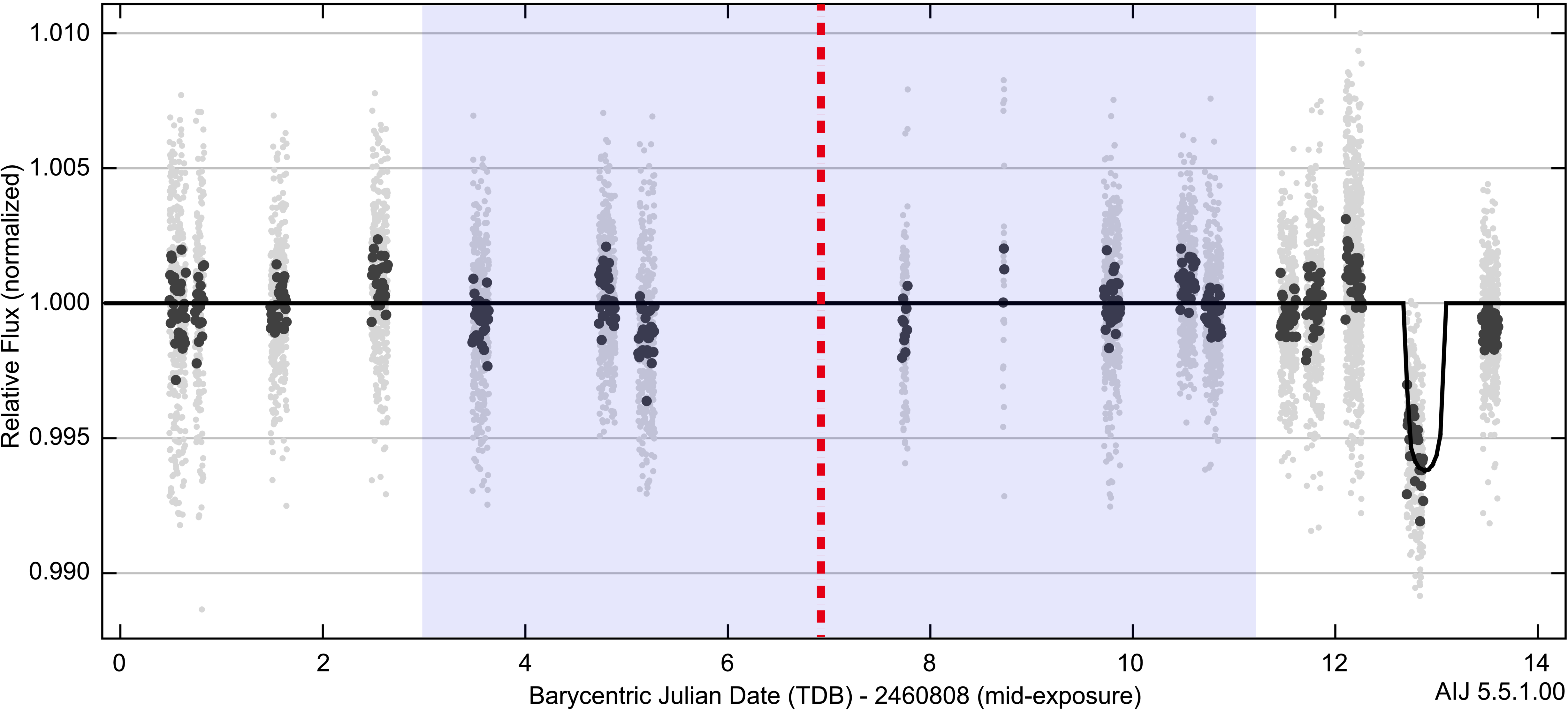 Multinight LCOGT 1.0 m ground-based follow-up lightcurve. The differential lightcurve was extracted using a common set of 22 reference stars and was normalized over the full dataset. No lightcurve detrending was applied. Gray symbols show the unbinned data. Black symbols show the data in 8 minute bins. The vertical red dashed line shows the nominal midtransit time based on the updated ephemeris from the global fit (Section 3), which is based on the single TESS transit detection and all available radial velocities. The blue shaded region indicates the midtransit time 1σ uncertainty window. The apparent 6 ppt in-transit detection is just outside the 1σ window. The bounds on the orbital period based on the TESS single transit, RVs, and the apparent LCOGT in-transit detection are P = 131.125 ± 0.012 days.