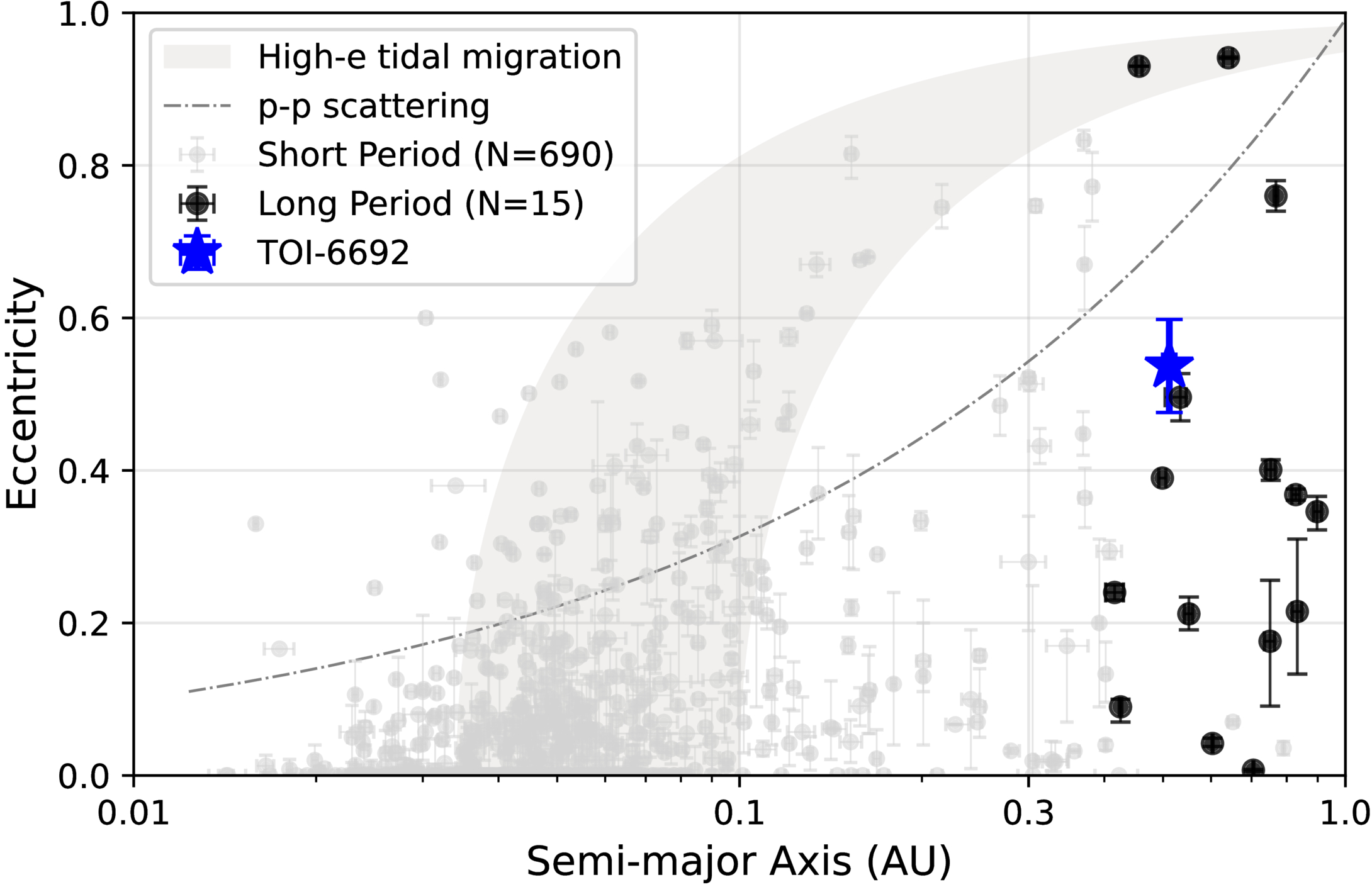 All transiting exoplanets in the range of 6–20 Earth radii. Planets with periods less than 100 days are plotted in light gray, and the 16 planets with periods longer than 100 days are plotted in black. TOI-6692 b is plotted as a blue filled star. The gray region illustrates planets that are likely undergoing high-eccentricity tidal migration. The upper and lower limits of the track are set by the Roche limit and the tidal circularization timescale (J. Dong et al. 2021). The dotted–dashed line presents the theoretical upper limit of eccentricities as a result of planet–planet scattering, assuming a planet with a mass of 0.5 MJup and a radius of 2 RJup, for illustrative purposes (C. Petrovich et al. 2014). Data were obtained on 2025 August 4 from the NASA Exoplanet Archive.