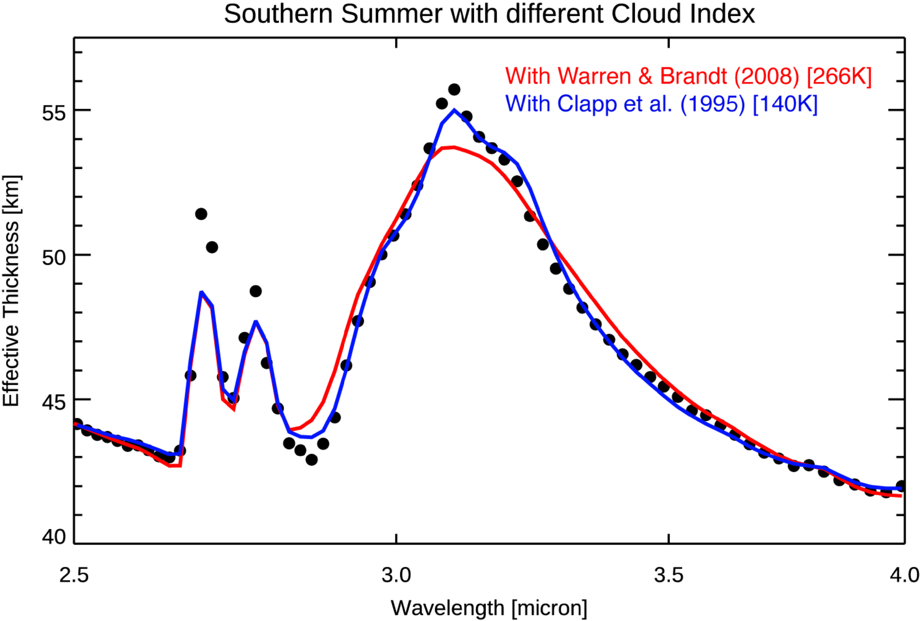 Same as the left panel in Figure 6(c), but showing a comparison between the synthetic spectra calculated with refractive index of H2O ice clouds by M. L. Clapp et al. (1995) (blue) and S. G. Warren & R. E. Brandt (2008) (red).