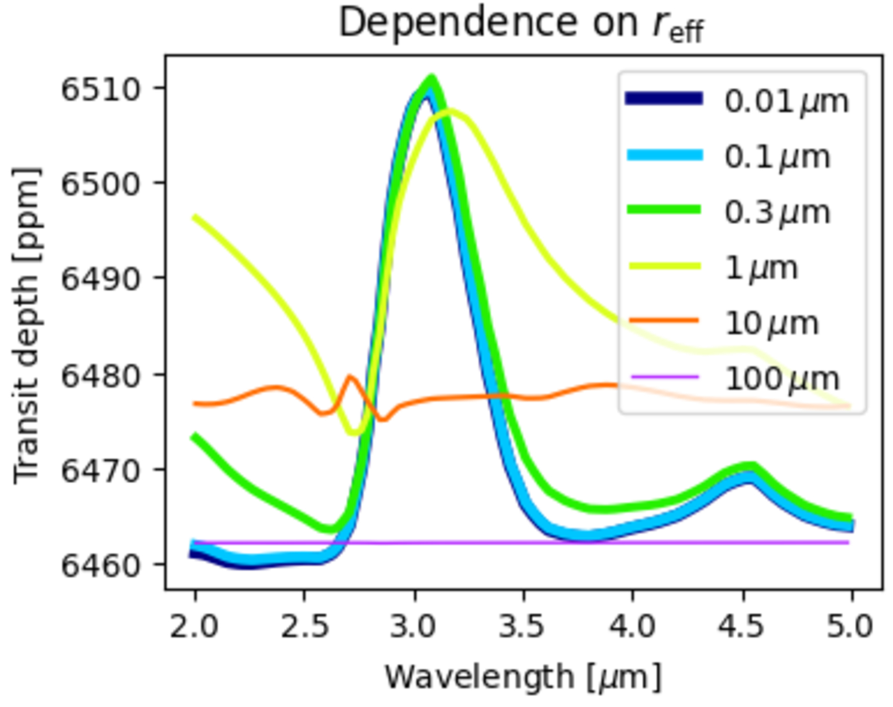 Dependence of the 3.1 μm H2O ice feature on the effective radius of H2O ice clouds. The CO2 feature and slope are removed. The standard deviation of the radius distribution, assumed to be log-normal, is assumed to be ﹩\mathrm{ln}({\sigma }_{r})=0.1﹩. Planetary parameters are set to the values of TRAPPIST-1f.