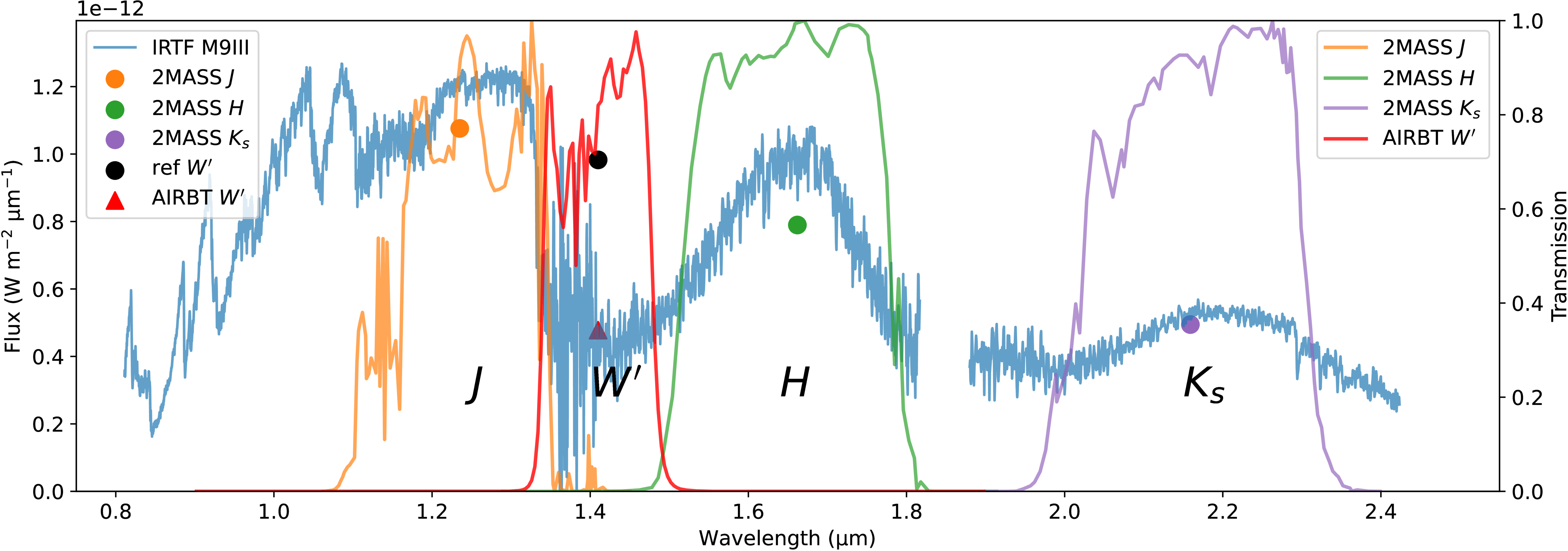 An example showing the calculation of optical depth τ. The blue line is a spectrum of an M9 giant BRIB1219-1336 from the IRTF spectral library, showing a water-vapor-absorption feature near 1.4 μm. The orange, green, and purple points are the J, H, and Ks fluxes converted from 2MASS magnitudes. The black point denotes the reference or continuum ﹩{W}^{{\prime} }﹩ flux from transformation, and the red triangle is the ﹩{W}^{{\prime} }﹩ flux obtained by convolving the spectrum with the filter transmission curve. The discrepancy between the expected ﹩{W}^{{\prime} }﹩ flux and the reference ﹩{W}^{{\prime} }﹩ flux reflects the water-vapor-absorption feature.