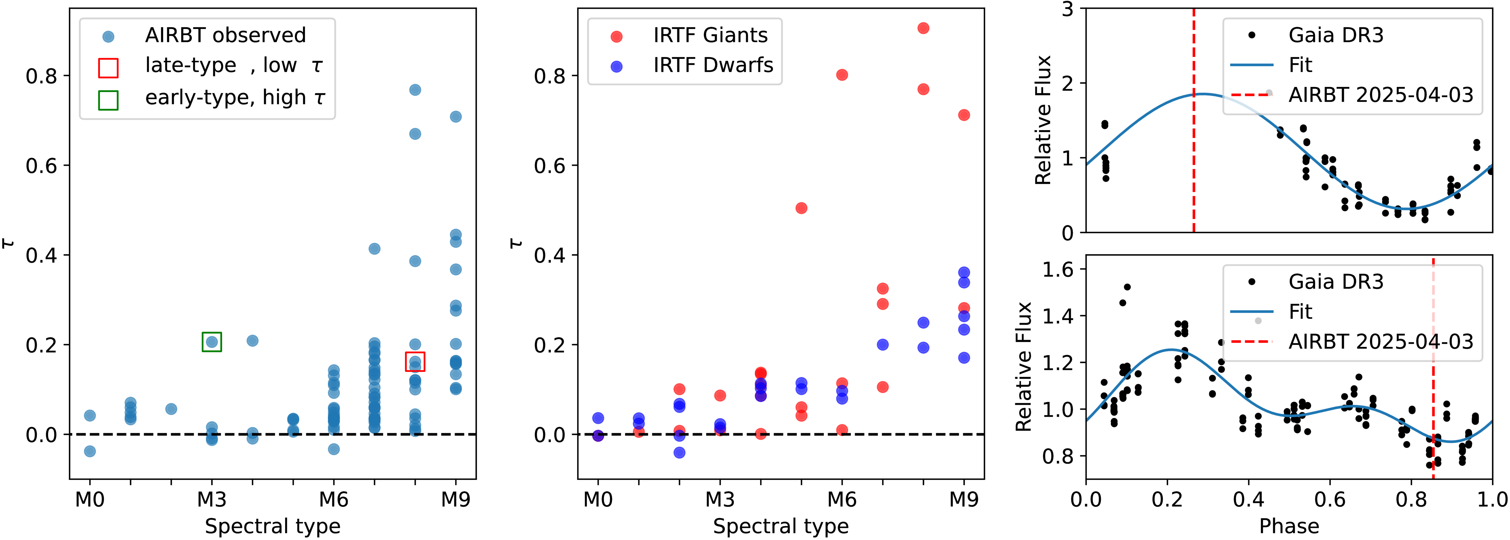 Left: relationship between optical depth τ and spectral type from AIRBT known M-type stars. Square points mark 2 examples examined in right panel. Middle: results from IRTF spectral library separated into giants (red) and dwarfs (blue). Right panels: the upper part is the light curve of the M8 giant Gaia DR3 5255960181168967808, classified as a late-type star but showing a low optical depth; AIRBT observed it near the brighter phase (red dashed line); the lower part is the light curve of the M3 giant Gaia DR3 5335159343746430836, classified as an early-type star but showing a high optical depth; AIRBT observed it near the fainter phase (red dashed line).