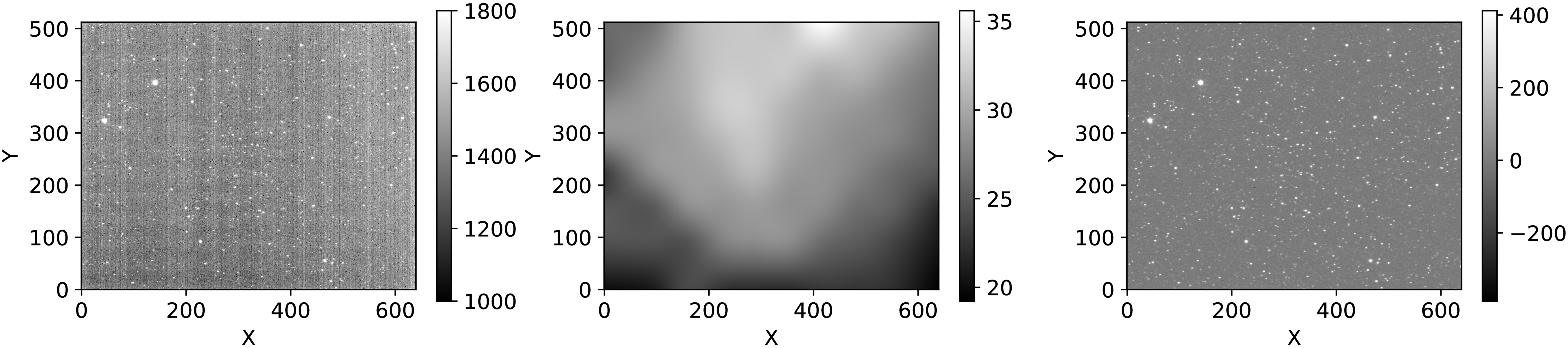 An example of raw (left), sampled sky-background residuals from SEP after first background subtraction (middle), and background-subtracted (right) image.