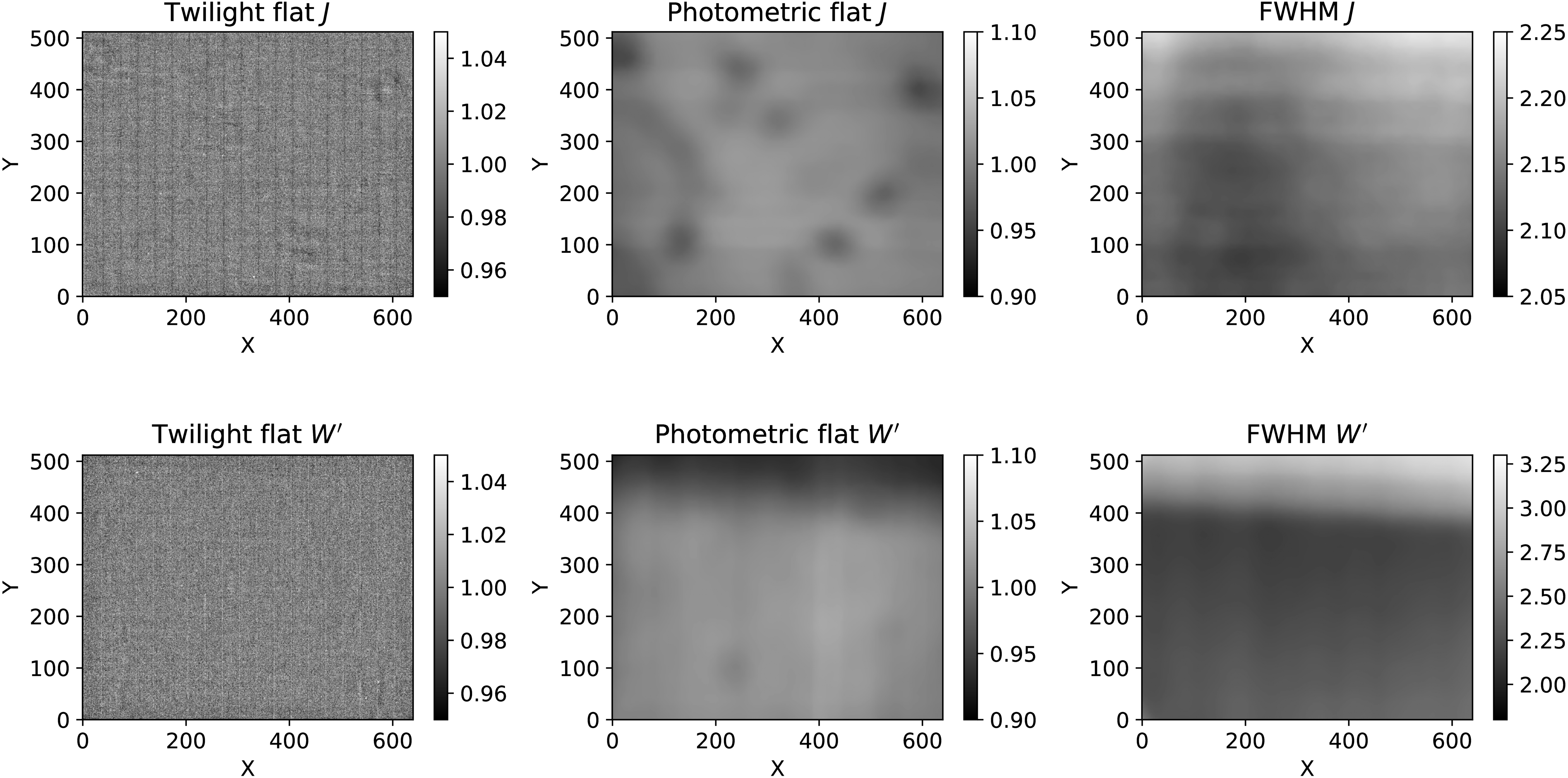 The upper (lower) panels show the twilight flat, photometric flat, and distribution map of the FWHM, respectively, for J (﹩{W}^{{\prime} }﹩) band. The dark spots in the J-band photometric flat are likely caused by ice crystals, while the striping in the ﹩{W}^{{\prime} }﹩-band photometric flat is correlated with the striping in the map of FWHM and may be introduced by the ﹩{W}^{{\prime} }﹩ filter, which will be inspected on the next expedition.