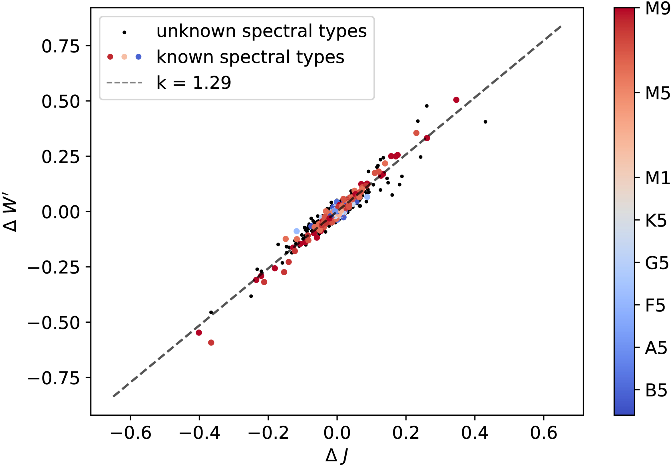 Magnitude variations of J and ﹩{W}^{{\prime} }﹩ bands between each pair of the three nights of all stars. The colored points mark known stars from SIMBAD (∼10%), and the black points are stars without spectral type information (∼90%). The black dotted line is the best fit of stars in the range ∣ΔJ∣ > 0.05 and ﹩| {\rm{\Delta }}{W}^{{\prime} }| \gt 0.05﹩ (∼5% of the stars).