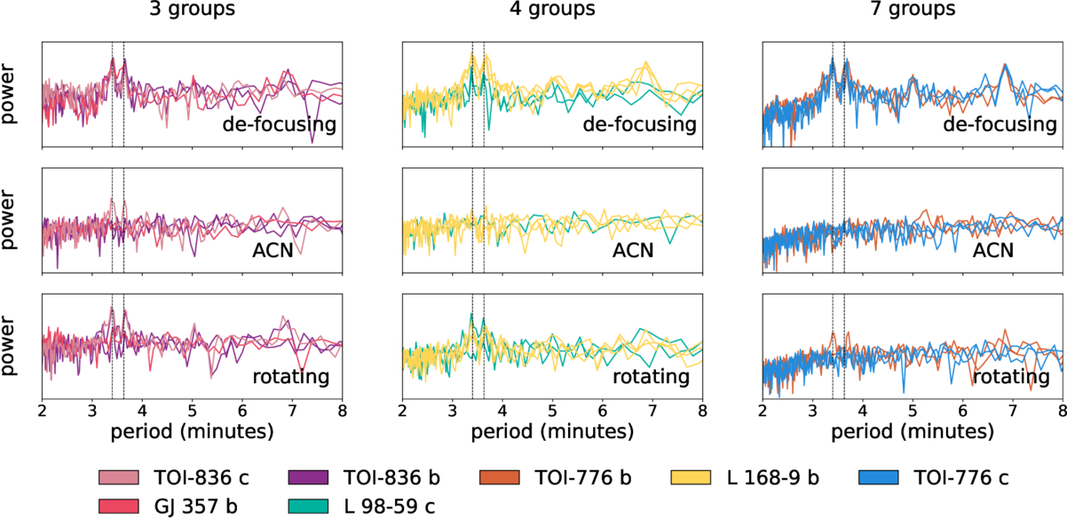 Superimposed power spectra for the principal components of the NRS1 RPF time series for all visits separated by three-group observations (left), four-group observations (middle), and seven-group observations (right). The most prominent peaks in the power spectra are identified with vertical dashed lines at 3.4 and 3.6 minutes. These peaks do not appear in observation. The colors map to the colors for each planet’s spectrum shown in Figure 8.