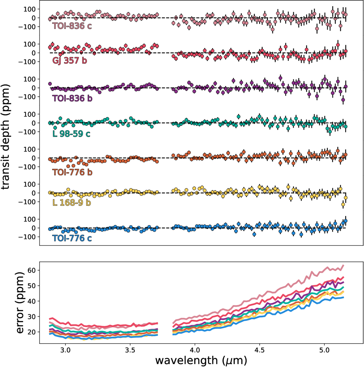 Top panel: spectra for each planet in the sample after subtracting off the mean to make it easier to visualize the amplitude of the scatter. No attempt has been made to correct for offsets between detectors. Bottom panel: error on transit depth measurements in ppm. For GJ 357 b, TOI-836 b, and TOI-836 c, these are the spectra obtained using the 6-vector systematics model, while for TOI-776 b, TOI-776 c, L 98–59 c, and L 168–9 b, these are the spectra obtained with the trend-only systematics model corresponding to the red points in Figure 6.