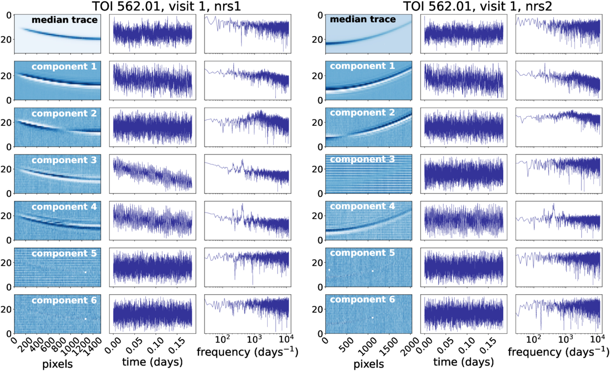 Principal components of the relative pixel fluxes (RPFs) for the first visit of GJ 357 b for NRS1 (left panel) and NRS2 (right panel). Left column of each panel: map of correlation coefficients between individual pixel fluxes and each principal component in the detector plane. Lighter colors indicate pixels that have a high positive correlation with the principal component, and dark colored pixels have a large negative correlation. Center column of each panel: principal components of the RPFs. Right column of each panel: power spectral density (PSD) of the principal component. The full figure set (26 images) is available.