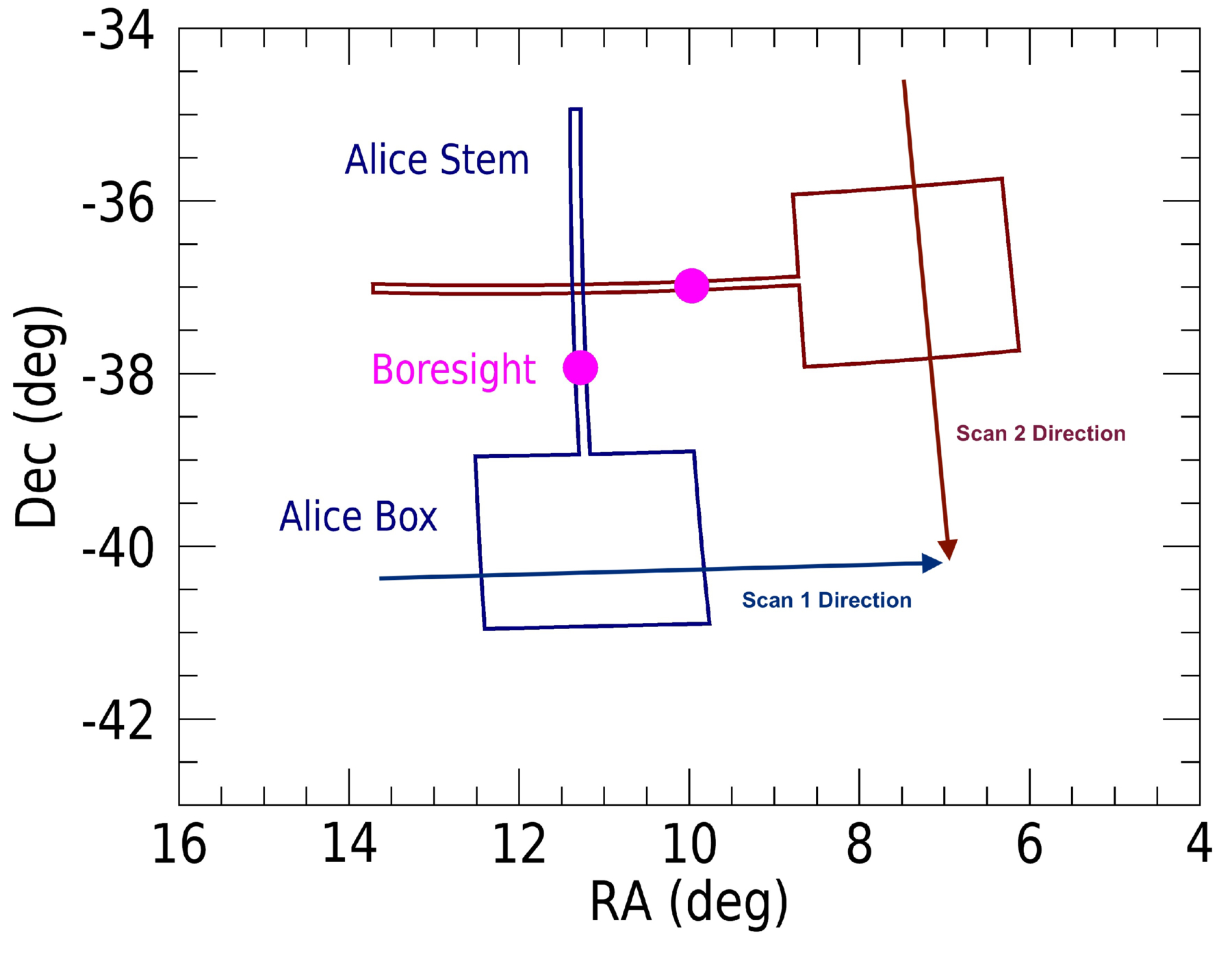 Visualization of the New Horizons Alice slit orientation at two times during the high-resolution Lyα scans. The spacecraft was slewed perpendicular to the slit first in decl., and then the slit was rotated to slew in R.A. for the narrow slot (stem) to cover the same 4° × 4° region.